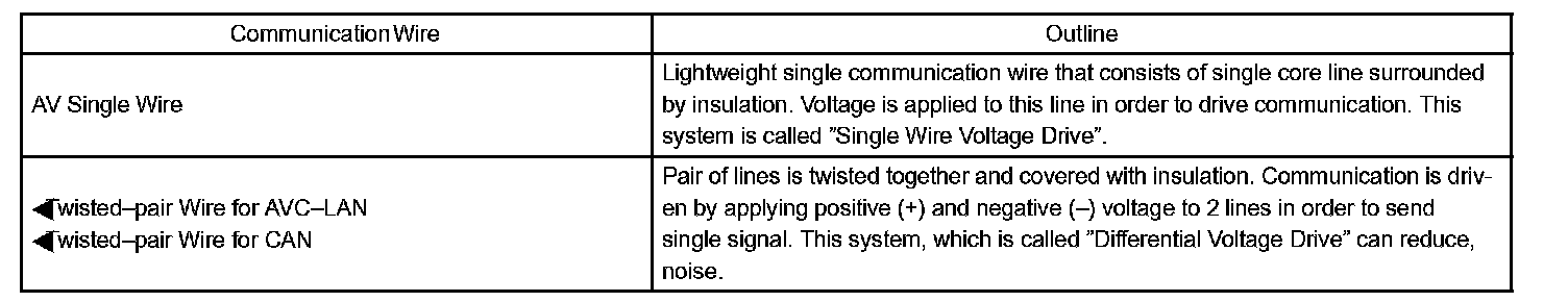 A single, Automobile Vinyl (AV) wire is used for BEAN communication. A twisted-pair wire is used for CAN and AVC-LAN communication.