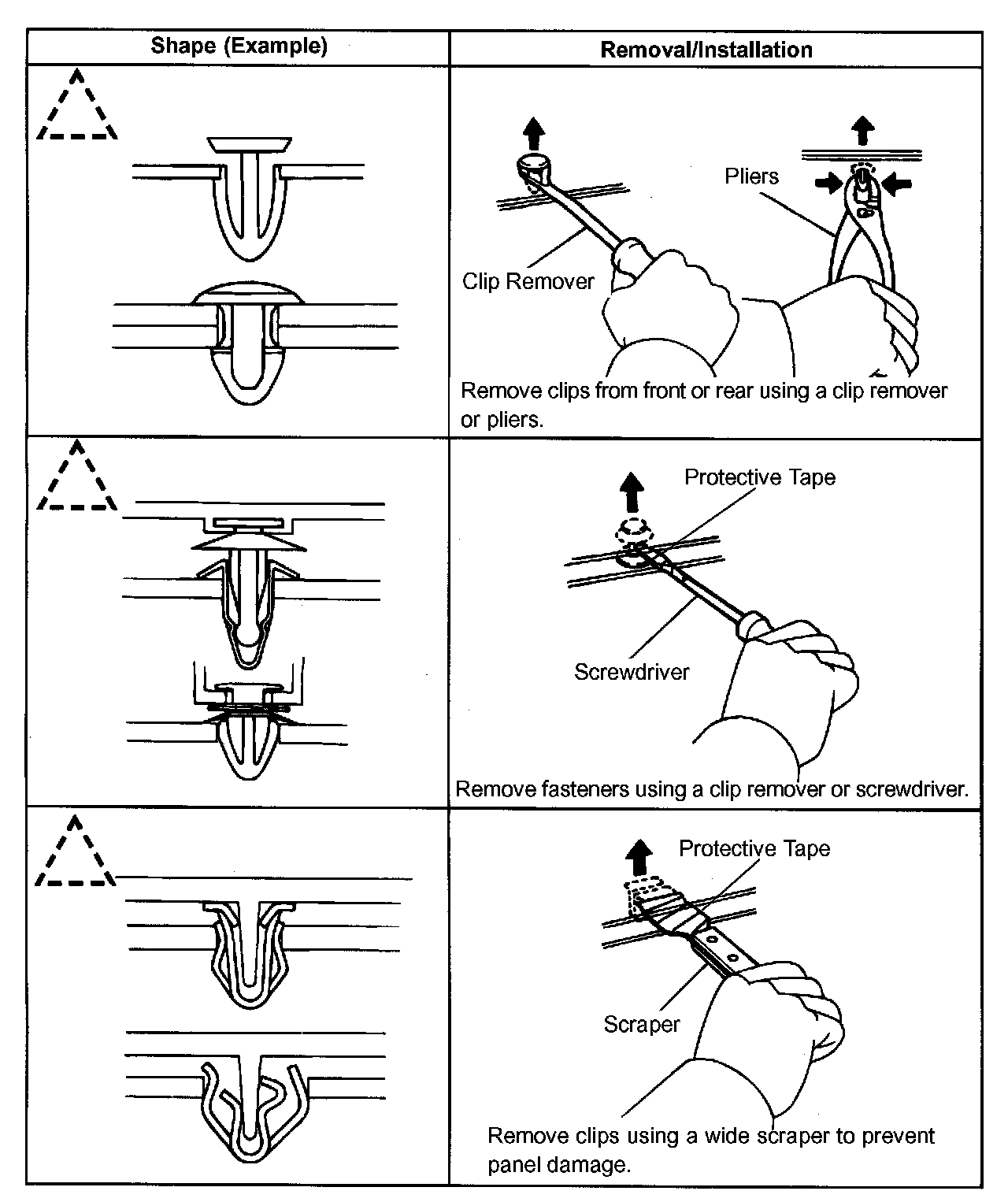 1. The removal and installation methods of typical clips used in body parts are shown in the table shown.
