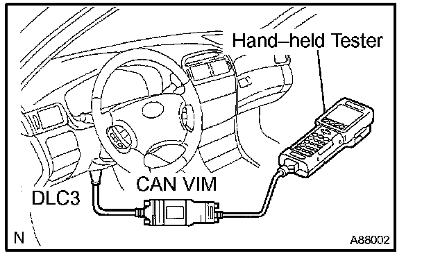 HINT: Connect the cable of the hand-held tester (with CAN VIM) to the DLC3, turn the ignition switch ON and attempt to use the hand-held tester. If the screen displays the message UNABLE TO CONNECT TO VEHICLE, there is a problem either with the vehicle or with the tester.