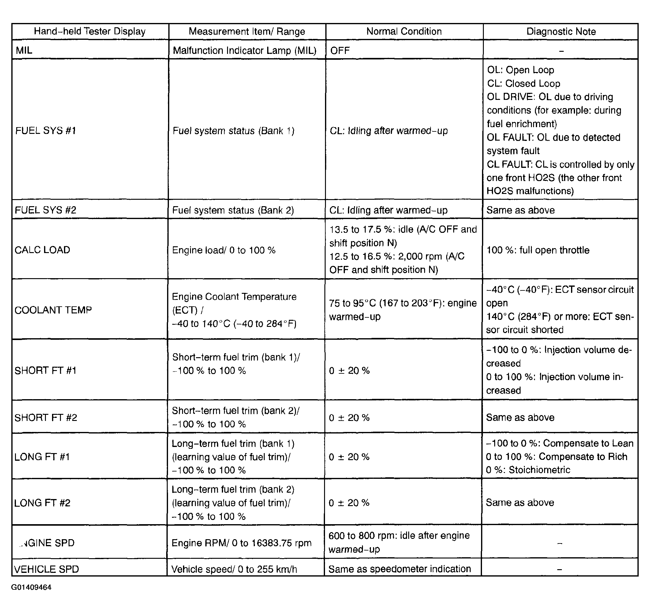 NOTE: In Fig 1 below, the values listed under "Normal Condition" are reference values. Do not depend solely on these reference values when deciding whether a part is faulty or not.- Warm up the engine.