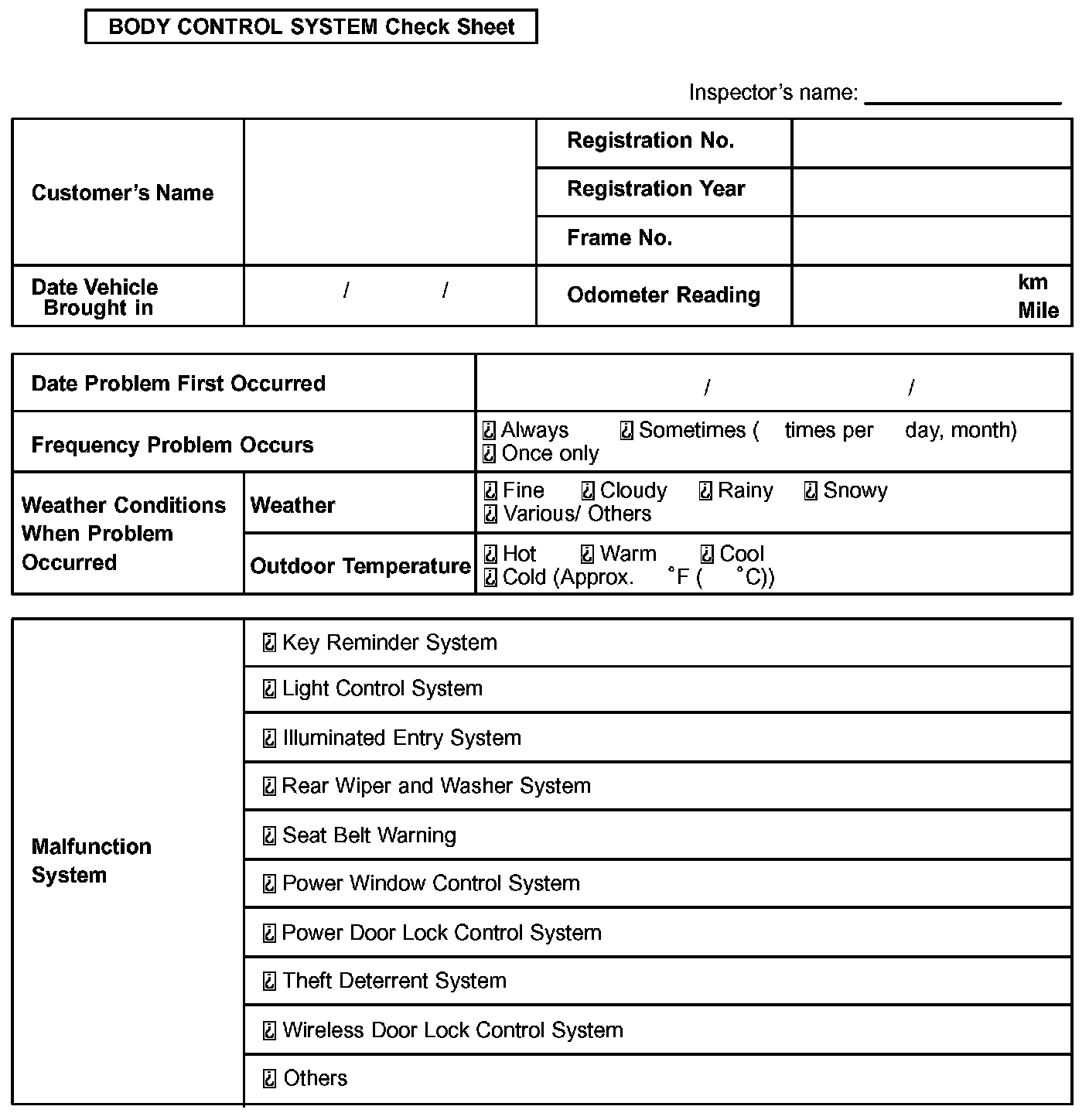 Body Control System Check Sheet: