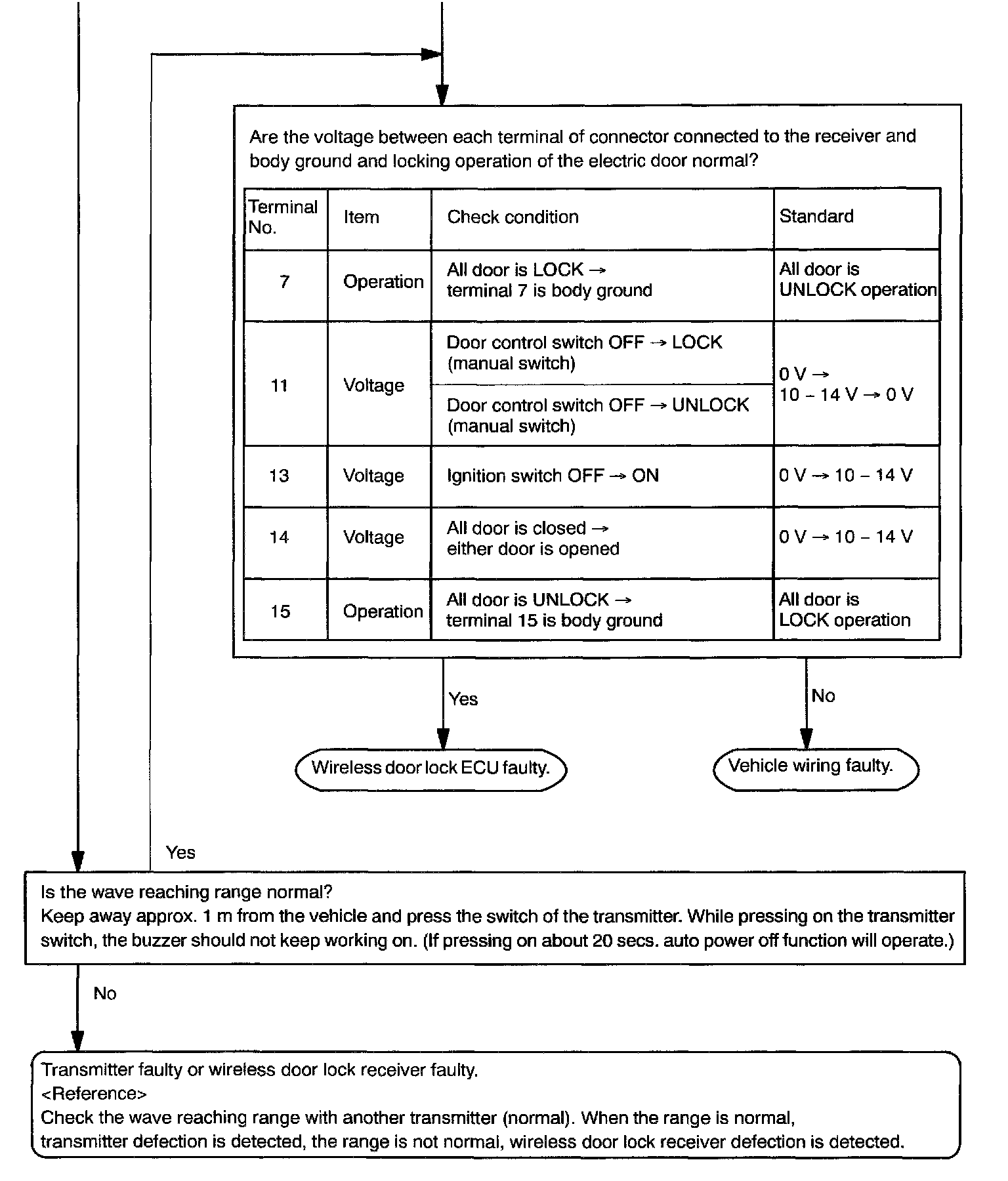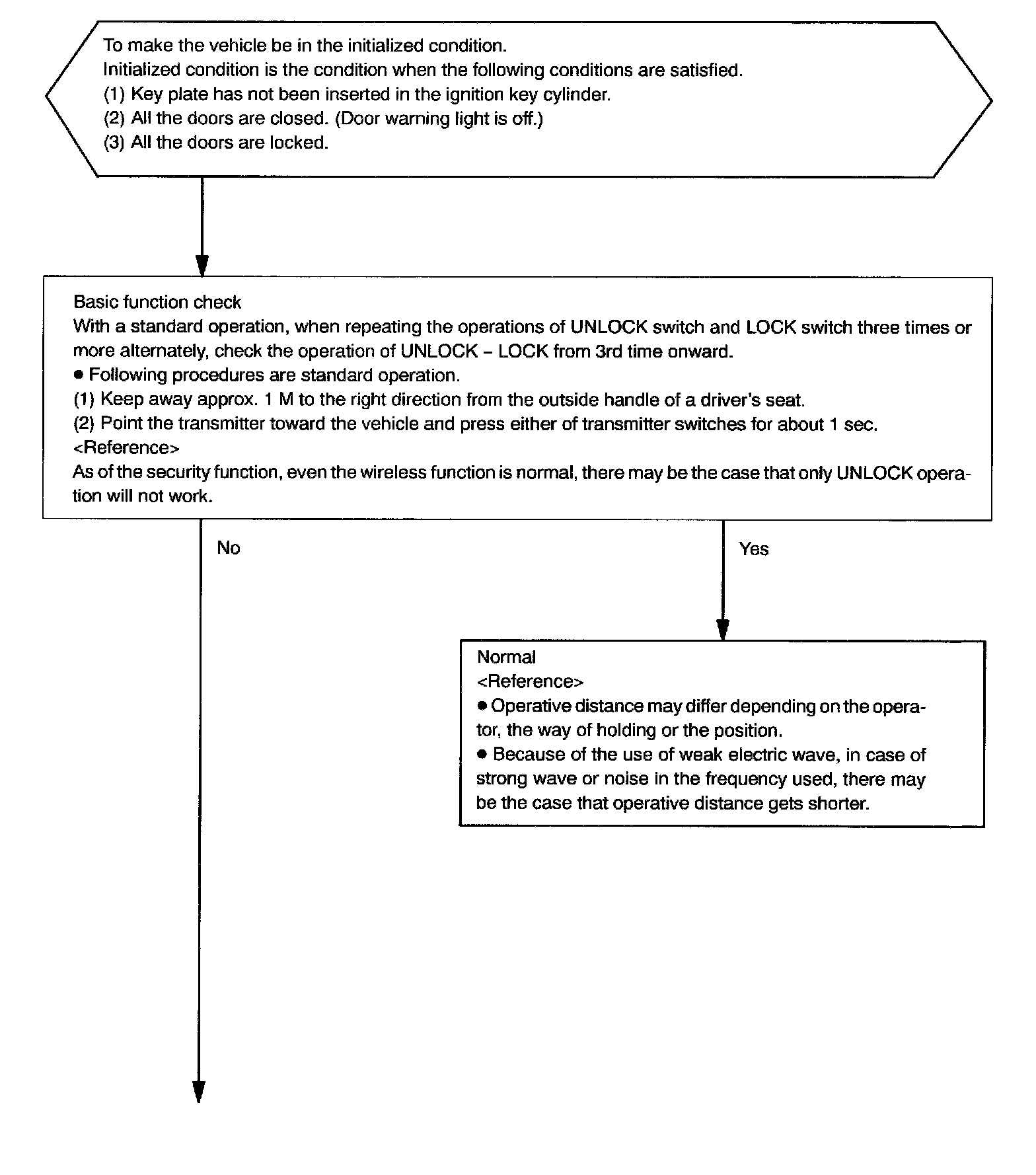 d. In the location where is approx. 1 M away from driver's outside handle in the right direction, face the key plate of the transmitter to the vehicle, and check the transmitter operation when pressing transmission switch.