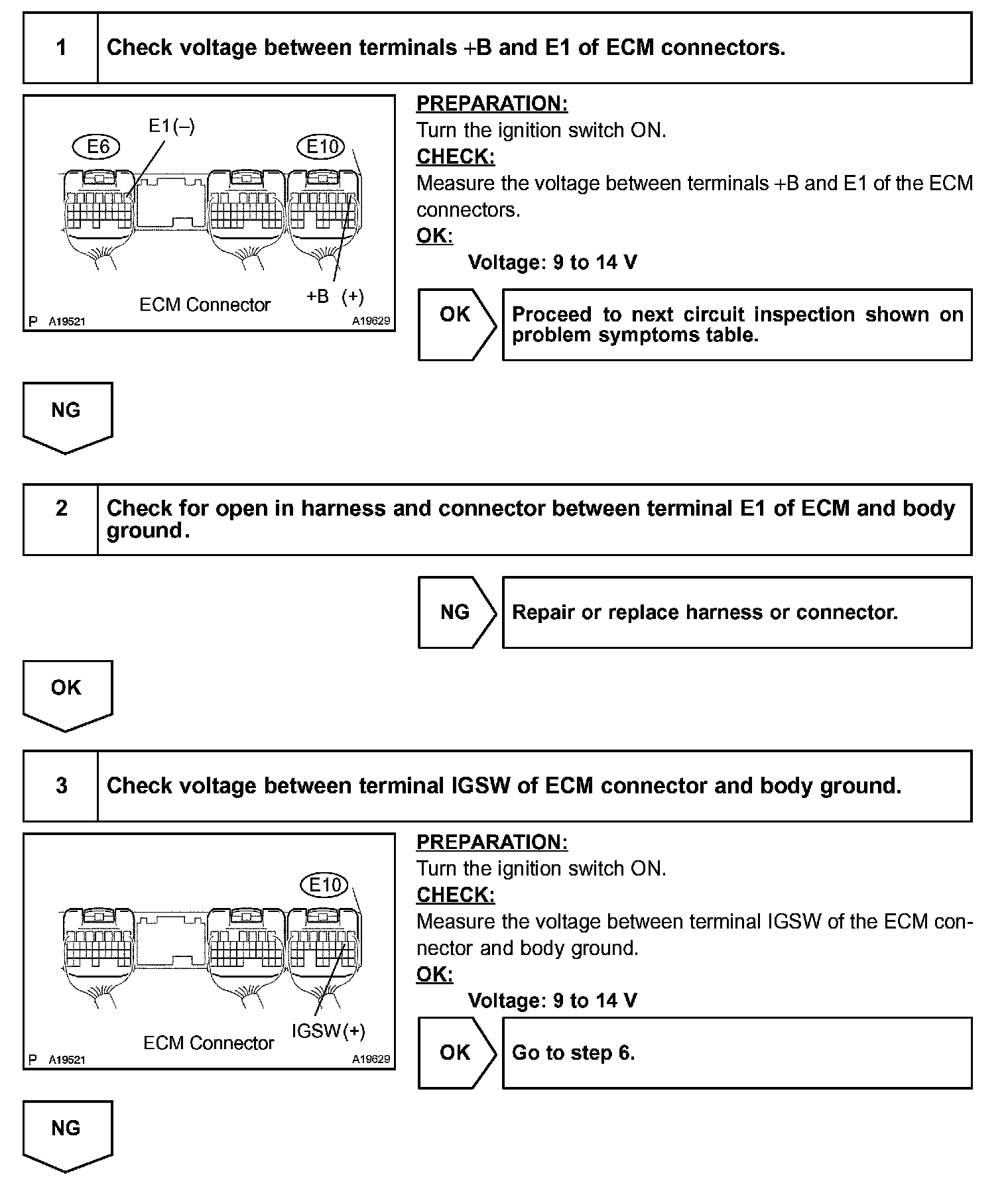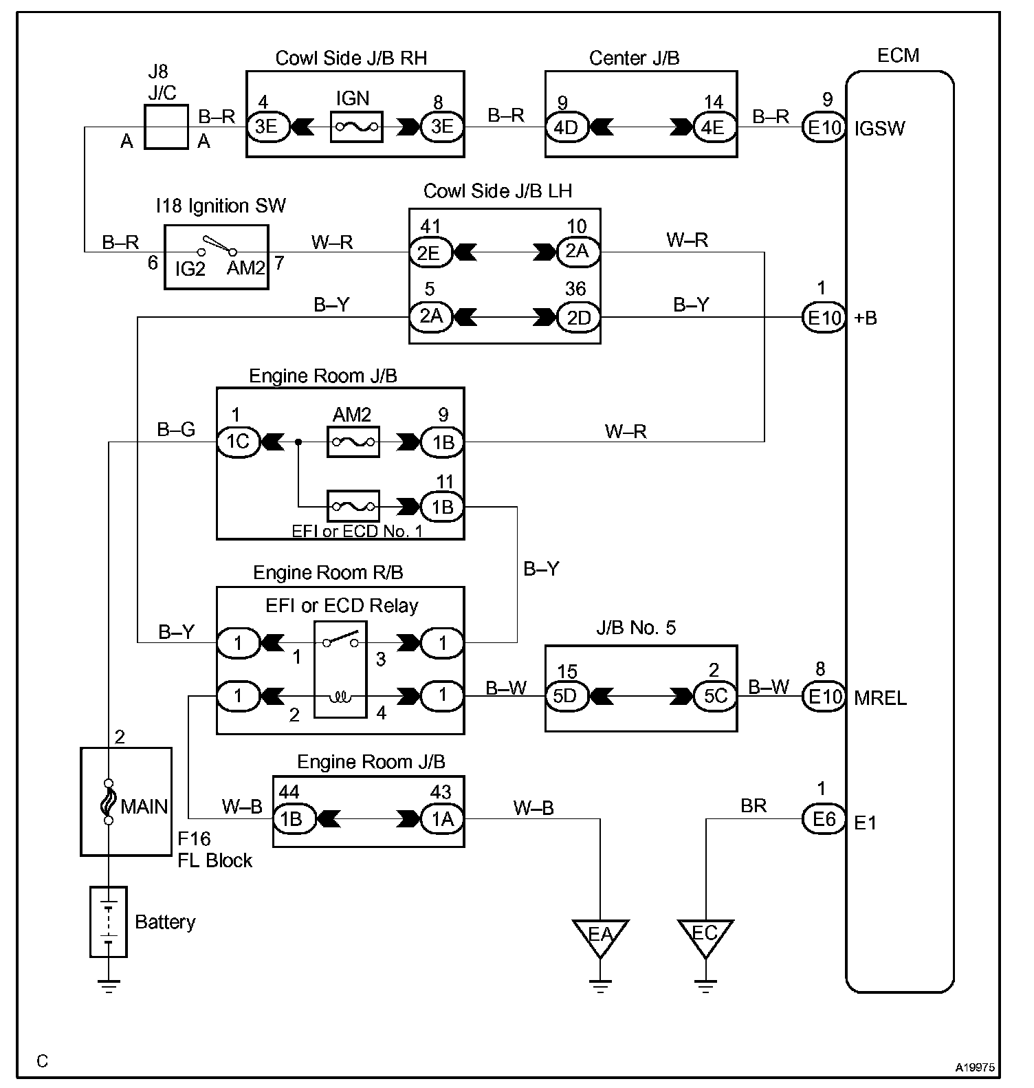 This signal causes current to flow to the coil, closing the contacts of the EFI or ECD relay and supplying power to terminal +B of the ECM.