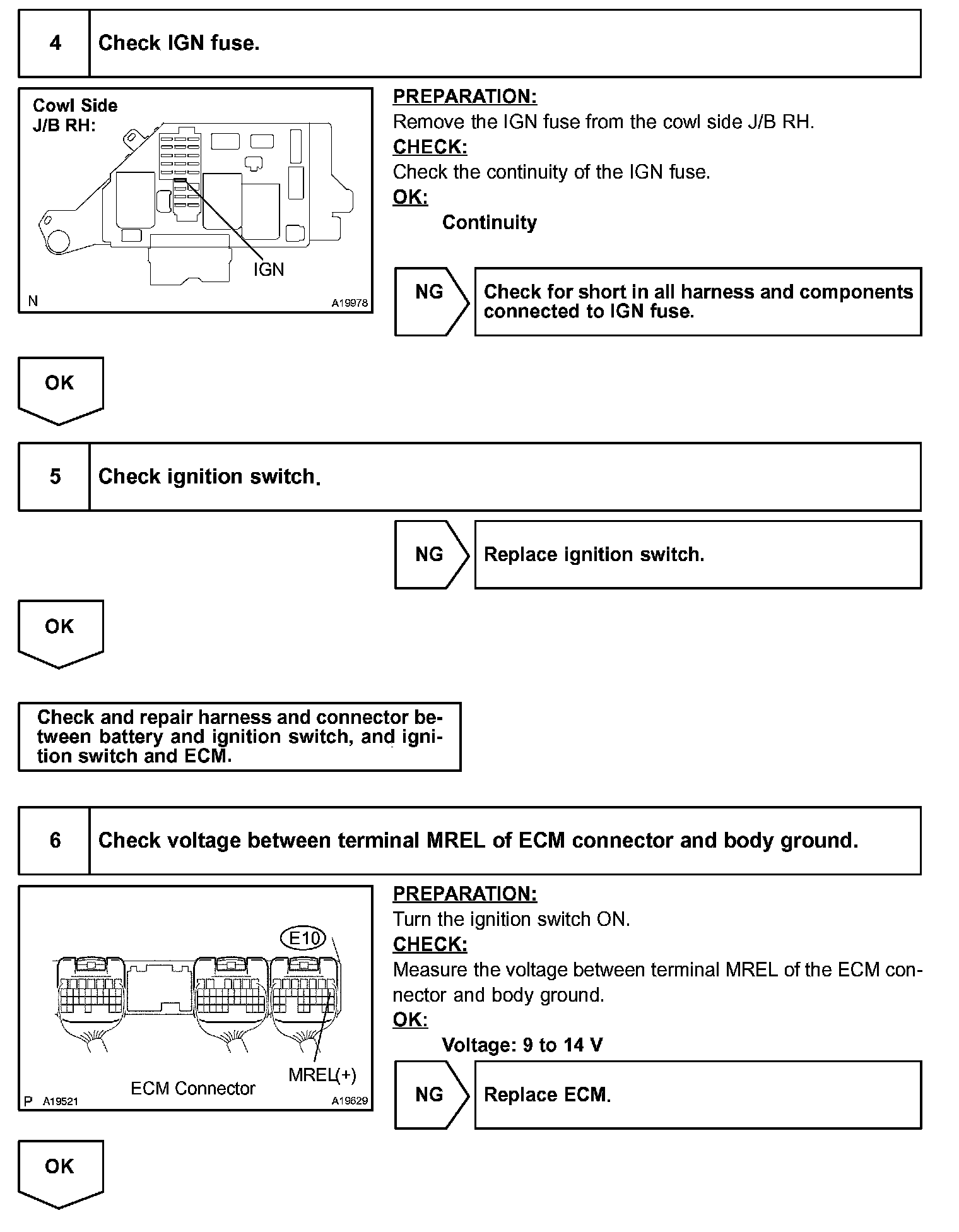 When the ignition switch is turned ON, battery positive voltage is applied to terminal IGSW of the ECM and the EFI or ECD relay control circuit in the ECM sends a signal to terminal MREL of the ECM switching on the EFI or ECD relay.