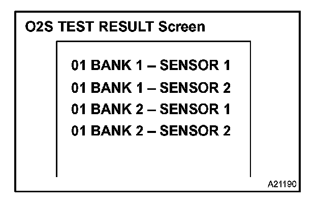 b. On the tester screen, select the following menus: DIAGNOSIS/CARB OBD II/O2S TEST RESULT. A list of the O2S equipped on the vehicle will be displayed.
