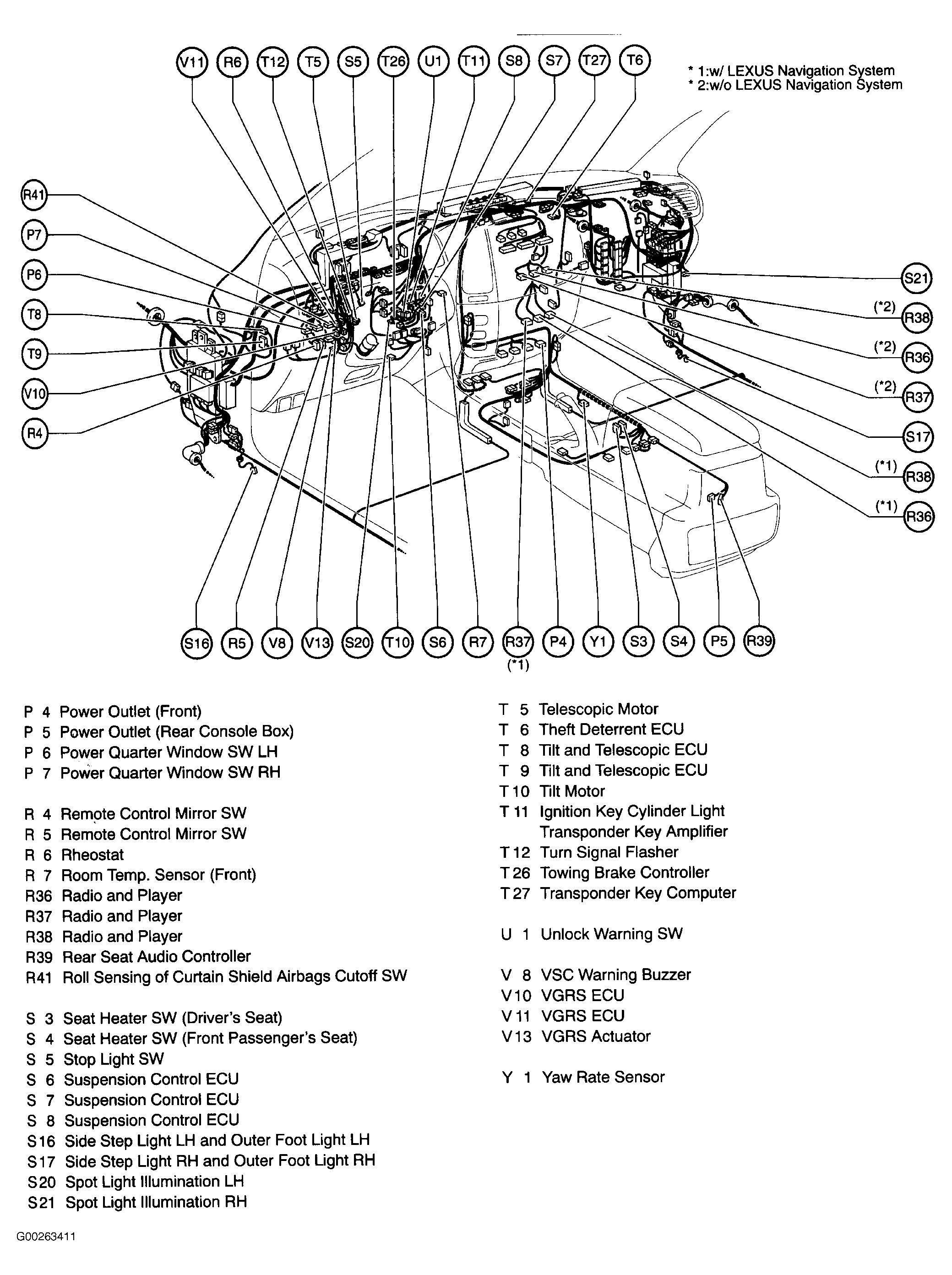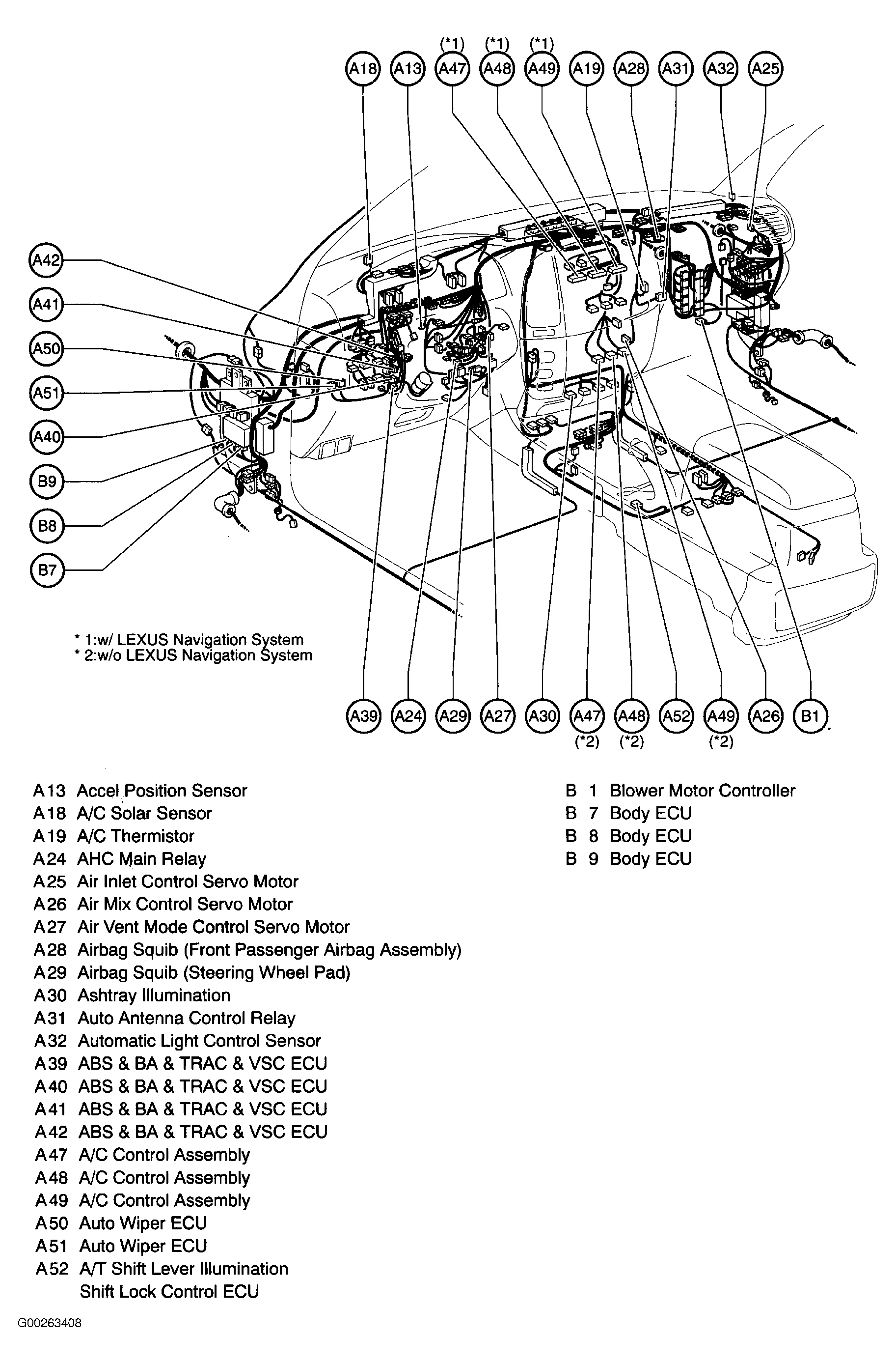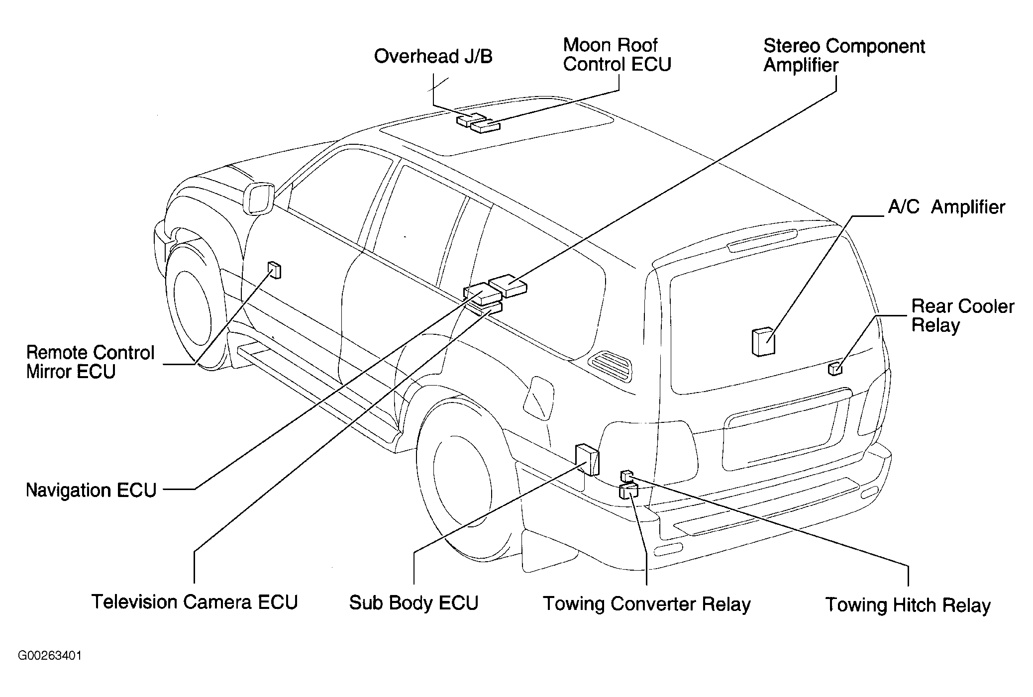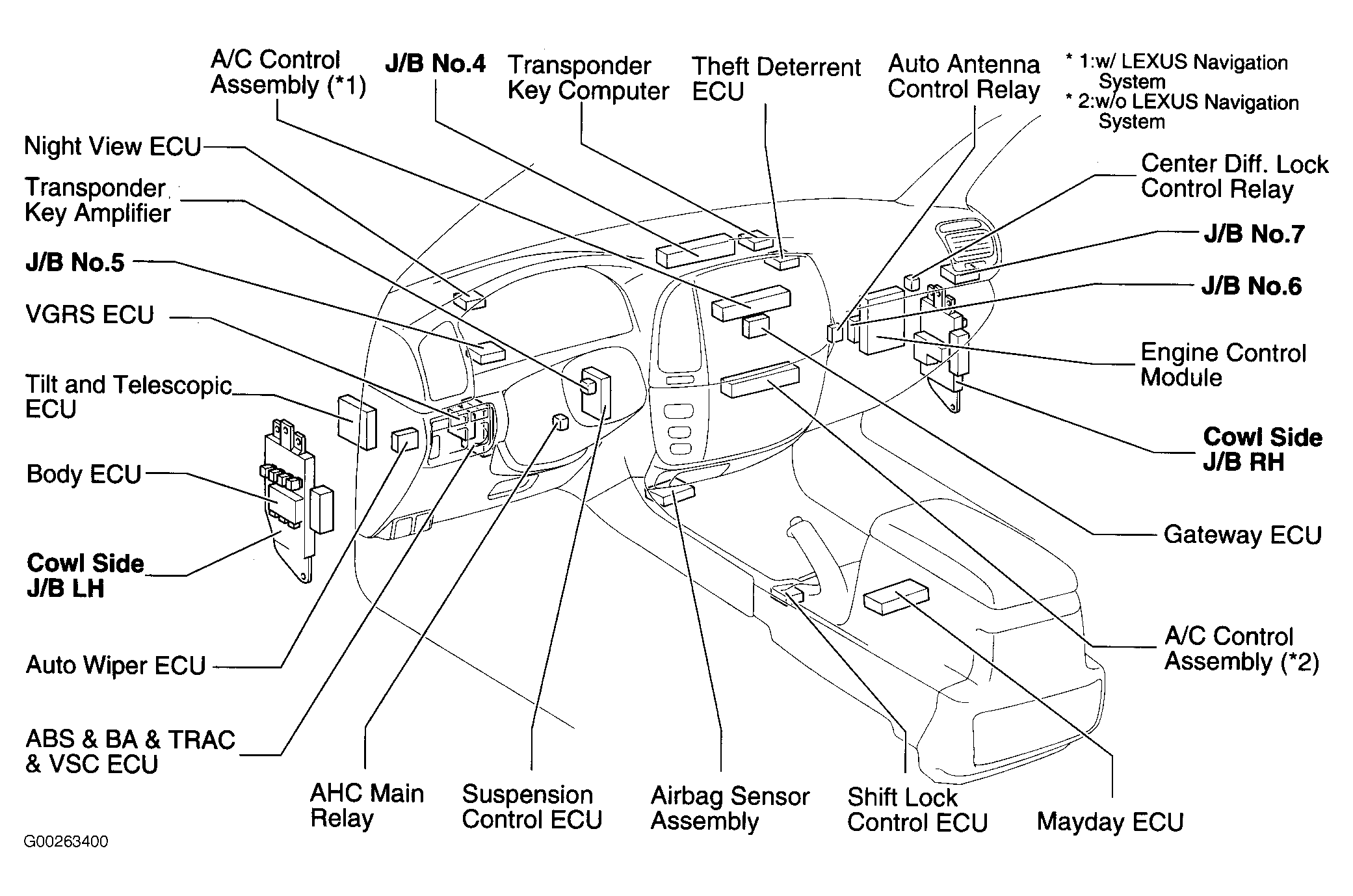 | Suspension Control ECU | Behind left center of dash. See Figure. |