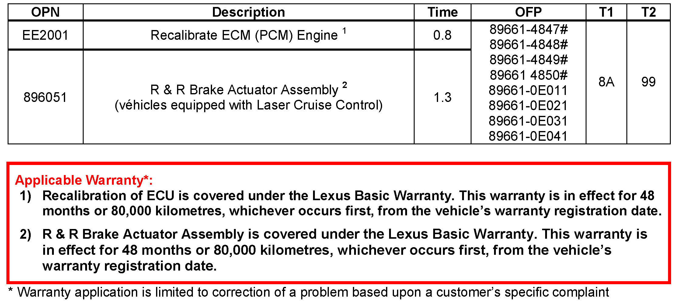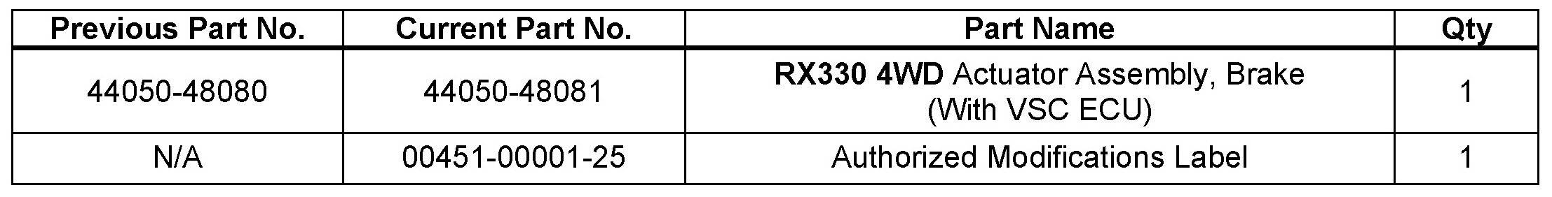7. For vehicles equipped with laser cruise control, a new Brake Actuator Assembly (with VSC ECU) must be installed at the time of recalibration. If vehicle is equipped with laser cruise, use the Parts Information table to order the correct part and follow the instructions listed on ETAS: 2004 model year RX 330 Repair Manual: Brake: ABS & Traction Actuator Assy: Replacement to replace the Brake Actuator Assembly (with VSC ECU).