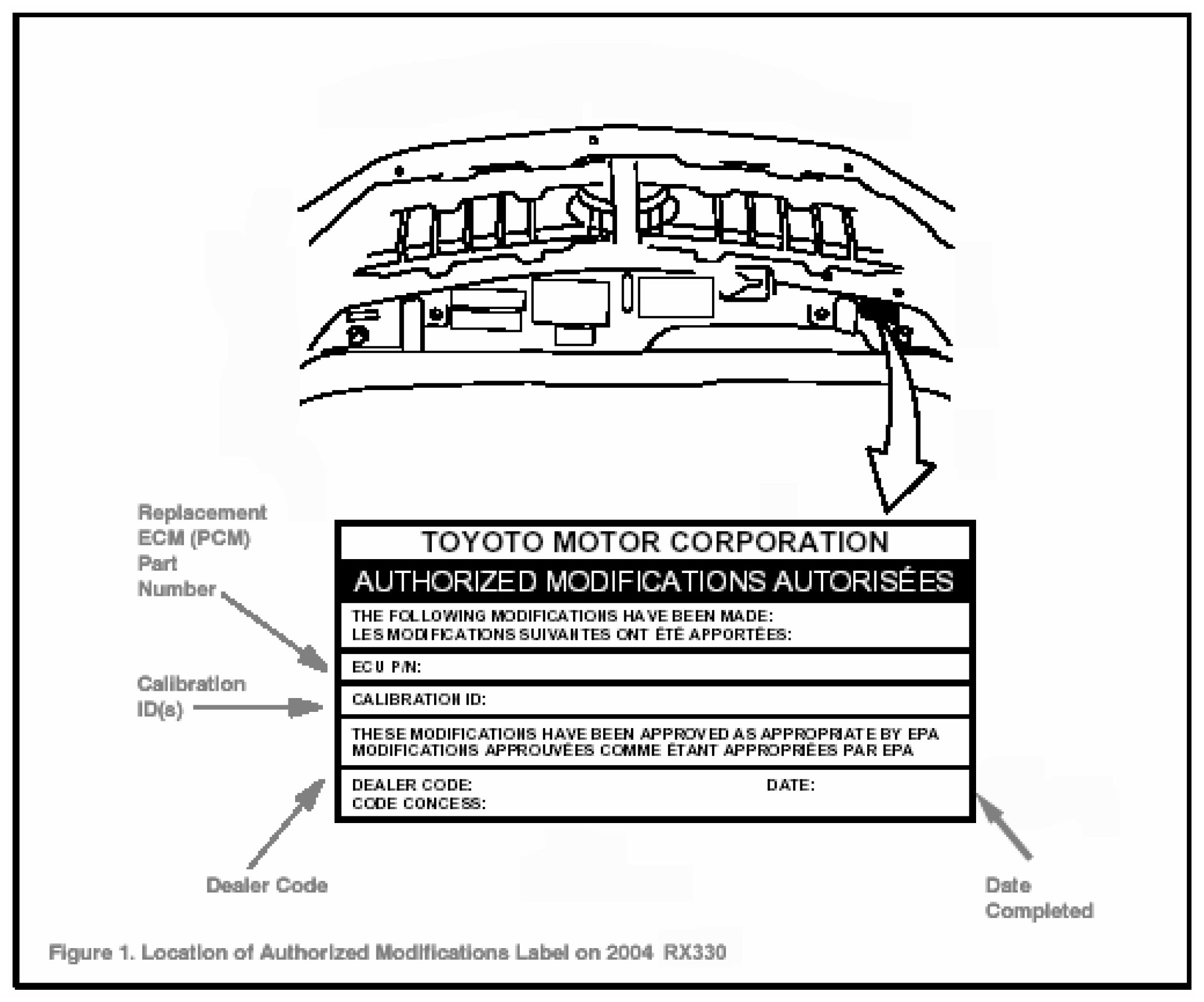1. Check for the Authorized Modifications Label affixed to the vehicle in the location shown in Figure 1. Confirm if ECM (PCM) calibration has been updated. If not latest ECM (PCM) calibration-go to step 2.