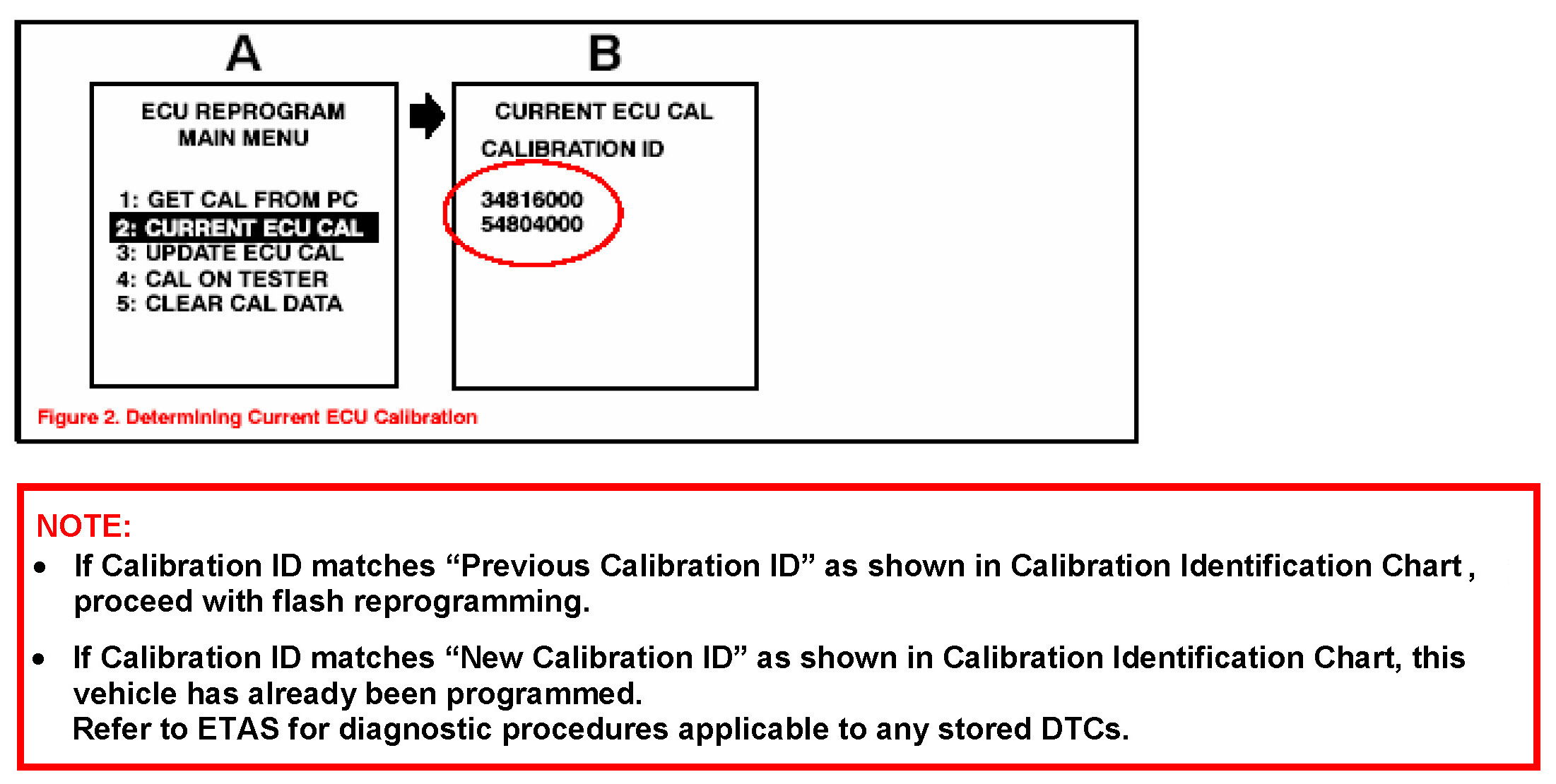2. Connect the Diagnostic Tester to the vehicle and select CURRENT ECU CAL from the ECU REPROGRAM MAIN MENU. Determine the vehicle's current ECU calibration (see Figure 2).