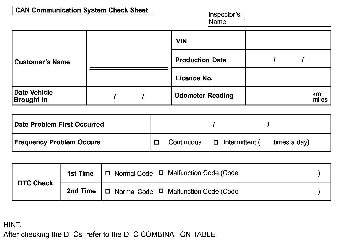 CAN Communication System Check Sheet:
