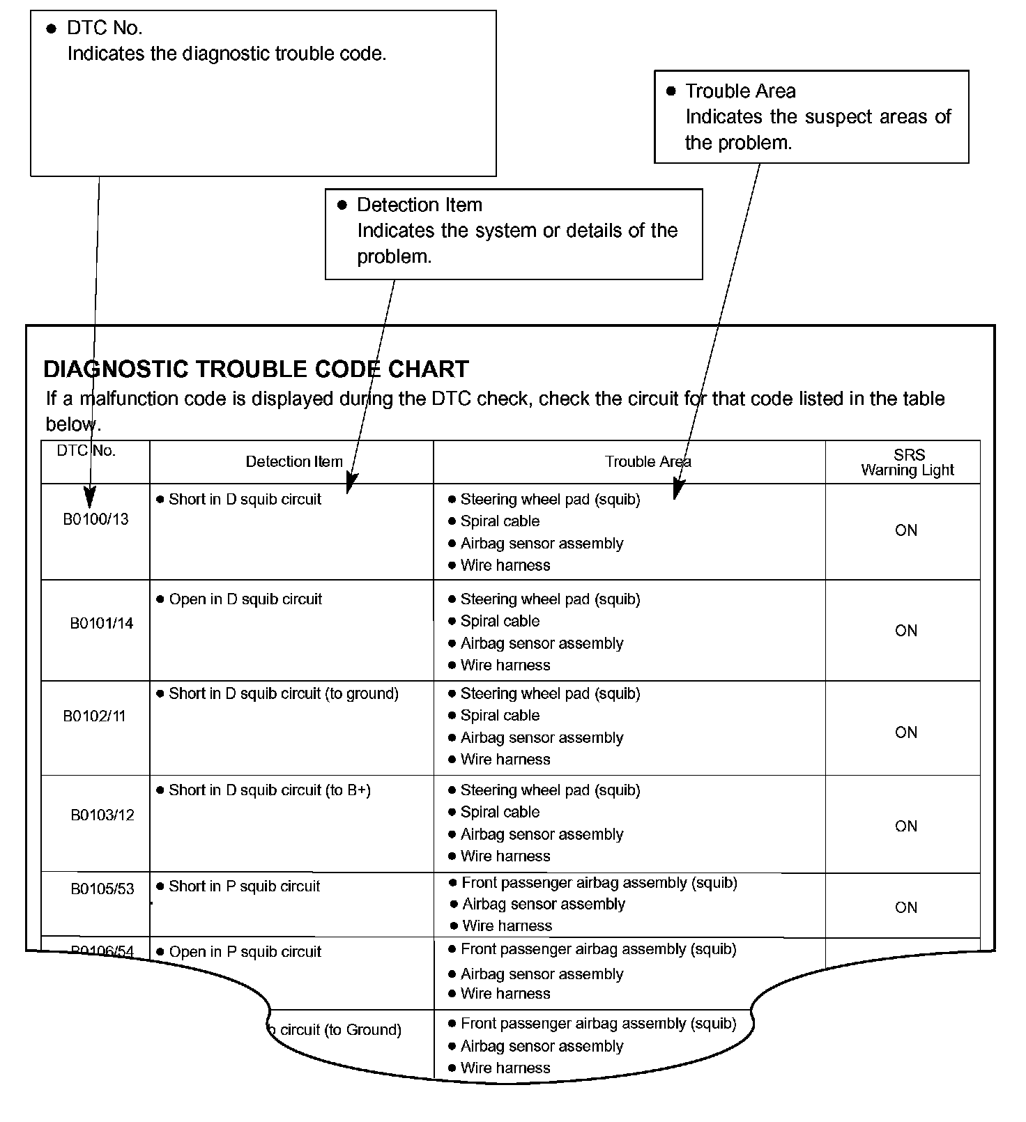 The inspection procedures are shown in the table. This table allows efficient and accurate troubleshooting using the diagnostic trouble codes displayed in the diagnostic trouble code chart. Proceed with troubleshooting in accordance with the inspection procedures listed in the diagnostic chart corresponding to the diagnostic trouble codes displayed. The diagnostic trouble code chart for the Supplemental Restraint System is shown as an example.