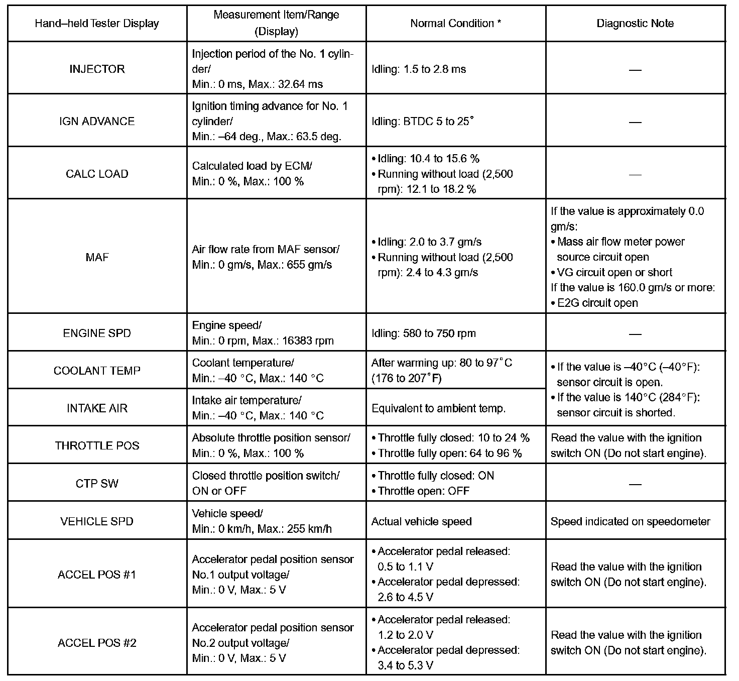 DATA LISTHINT: Using the DATA LIST displayed by the hand-held tester or the OBD II scan tool, you can read the value of the switches, sensors, actuators and so on without parts removal. Reading the DATA LIST as a first step of troubleshooting is one method to shorten diagnostic time.