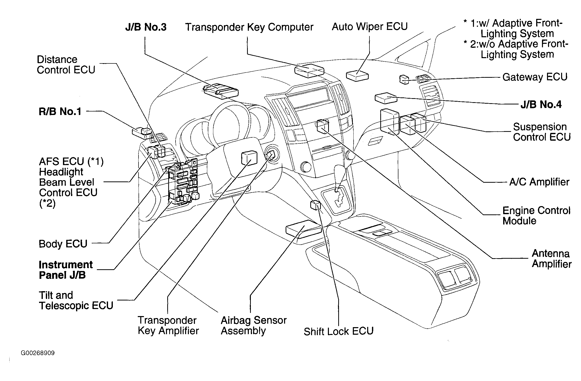 | Headlight Beam Level Control ECU | Behind left end of dash. See Figure. |