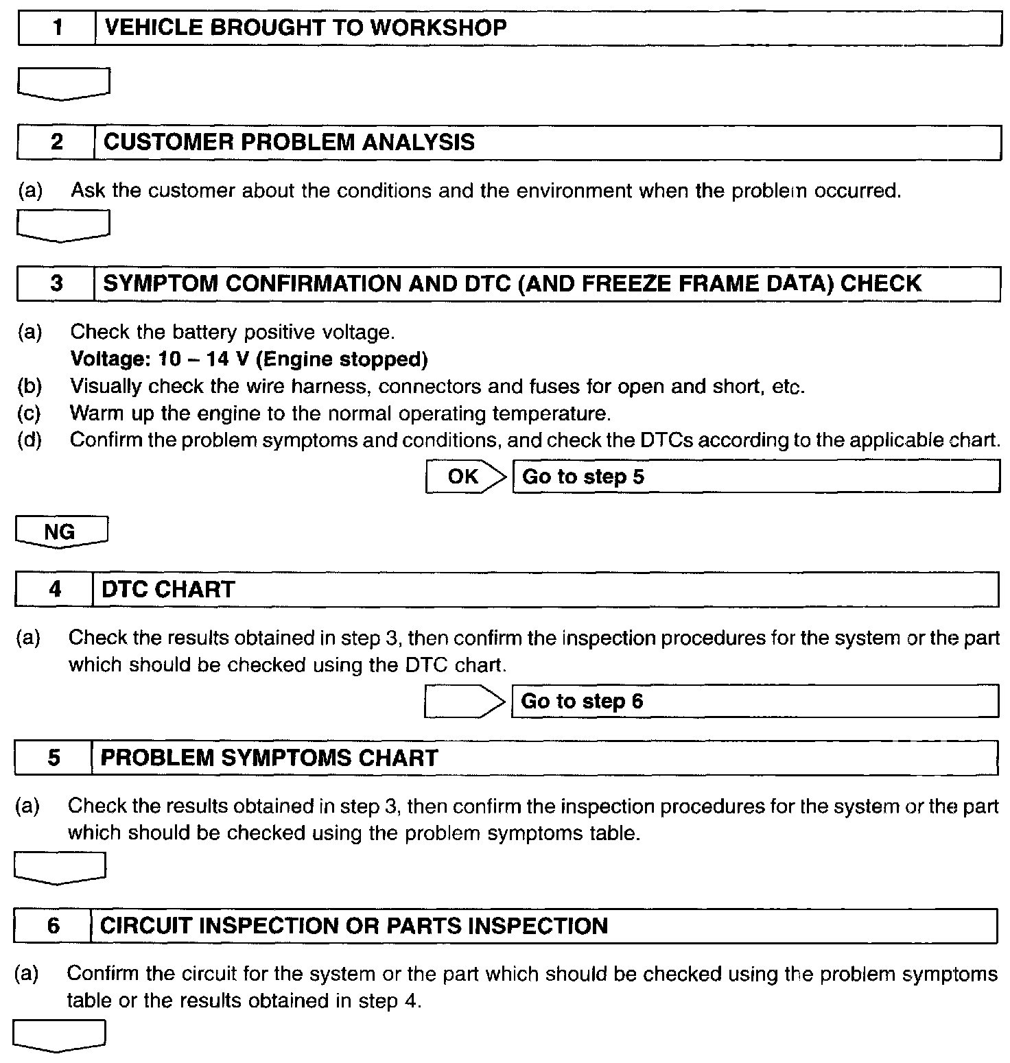 HOW TO PROCEED WITH TROUBLESHOOTINGHINT: Carry out a troubleshooting in accordance with the procedures given. Here, only the basic procedures are shown. Details are provided in the Diagnostic Section, showing the most effective methods for each circuit. Confirm the troubleshooting procedures first for the relevant circuit before beginning the troubleshooting of that circuit.