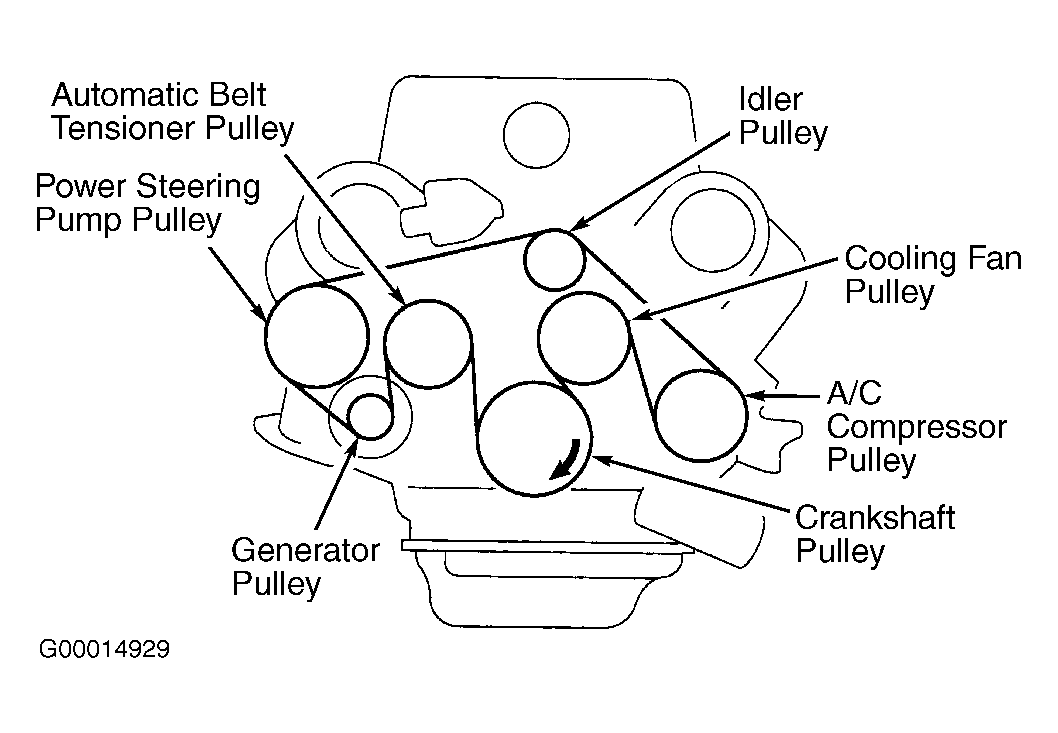 Generator is driven by a serpentine drive belt. Belt tension is maintained by an automatic belt tensioner. No adjustment is necessary. For belt routing, see Fig 1.