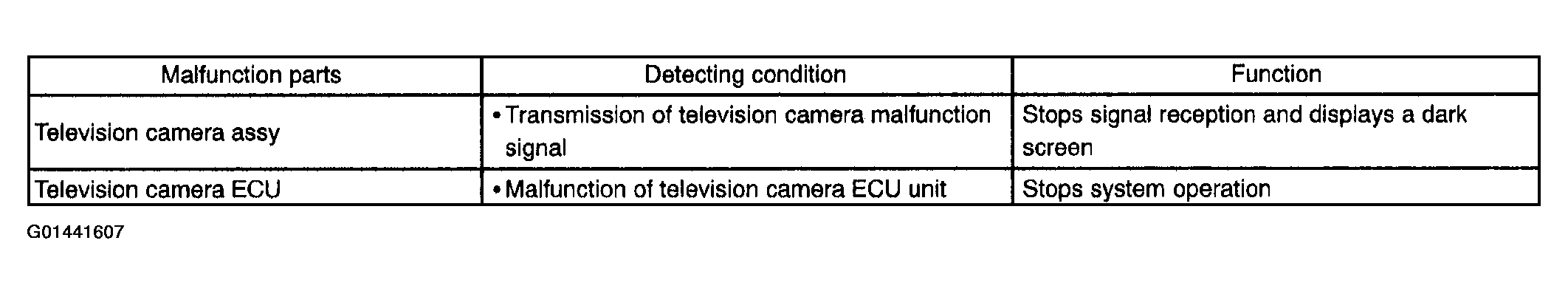 If the television camera ECU detects a malfunction, the fail safe functions shown in the figure Fig 1 below are activated.