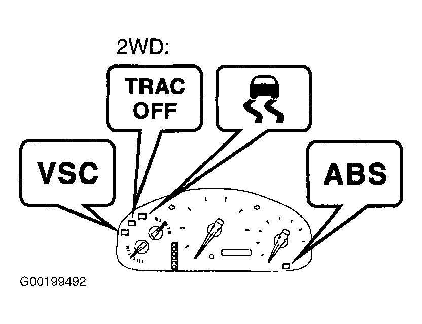 - When ignition switch is turned on, verify ABS warning light, VSC warning light, TRAC OFF indicator light (2WD only) and SLIP indicator light turns on for approximately 3 seconds.