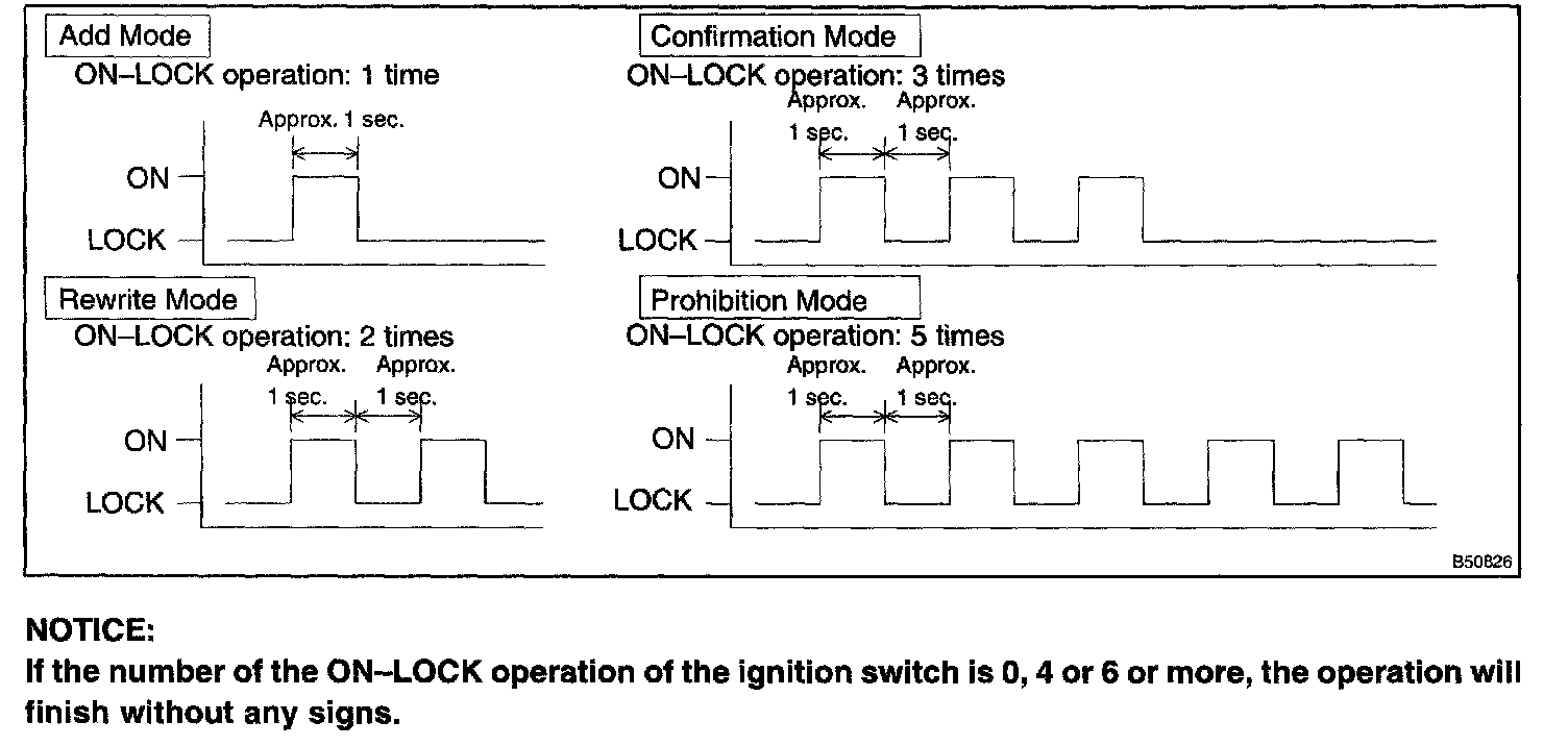 4. Turn the ignition switch from LOCK to ON and back to LOCK at approx. 1 second interval 1 to 5 times to select the mode. Then remove the key from the ignition key cylinder.