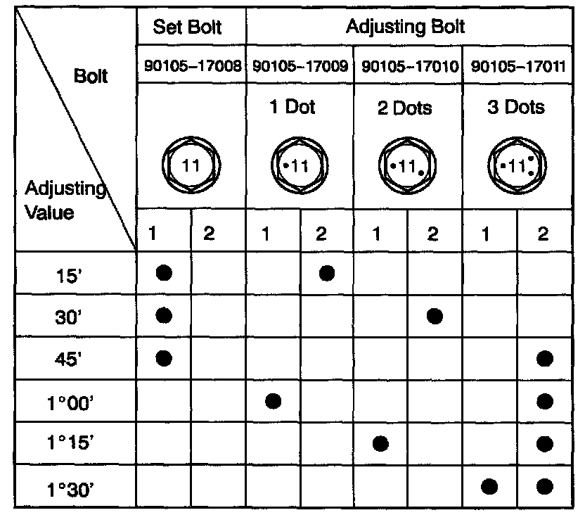 If the camber is not within the specified value, using the table shown, estimate how much additional camber adjustment will be required, and select the camber adjusting bolt.