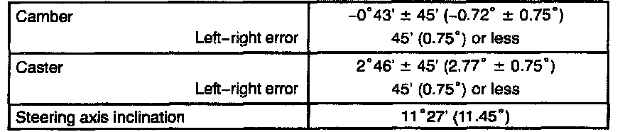 If the caster and steering axis inclination are not within the specification, after the camber has correctly adjusted, recheck the suspension parts for damaged and/or worn out parts.