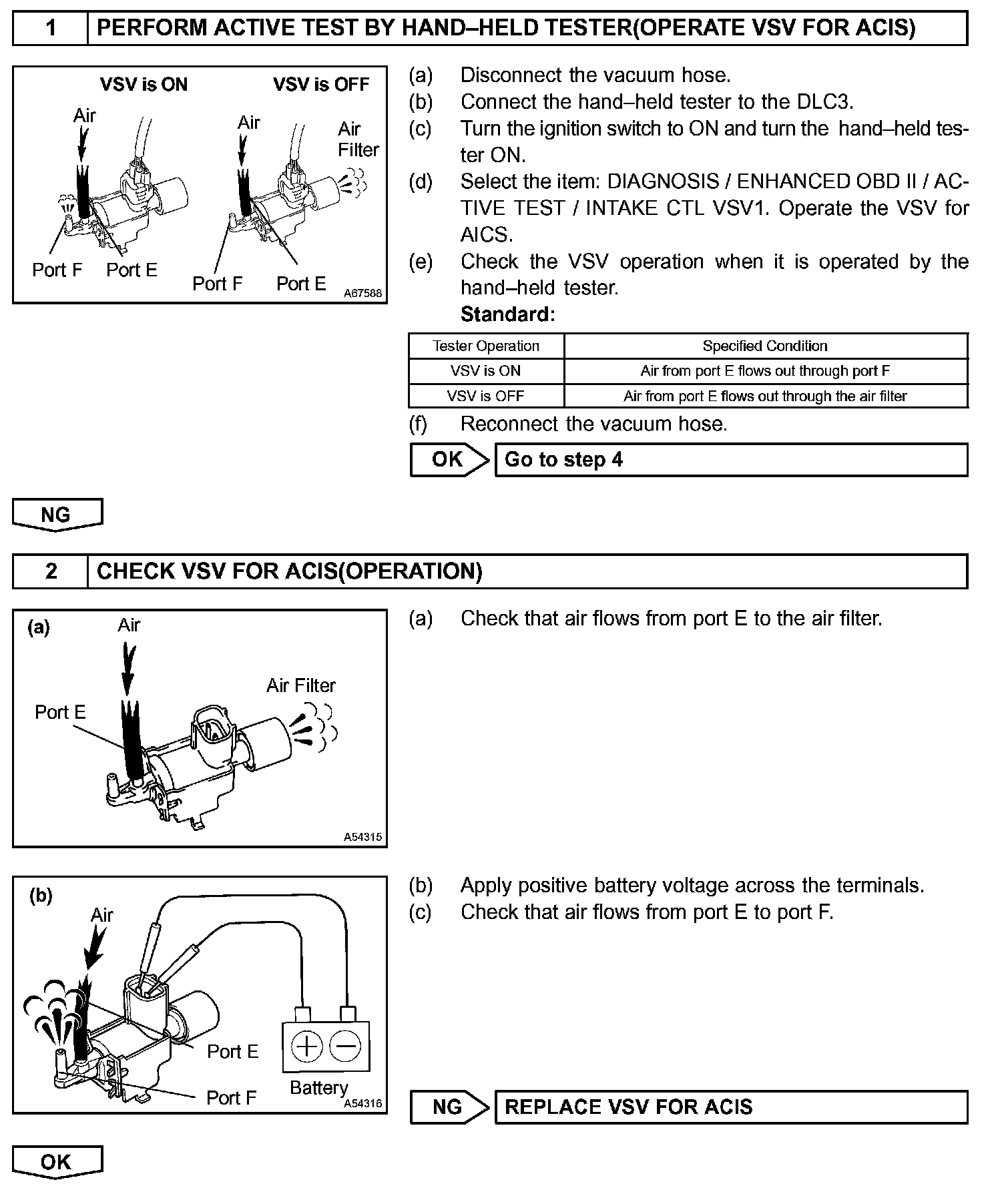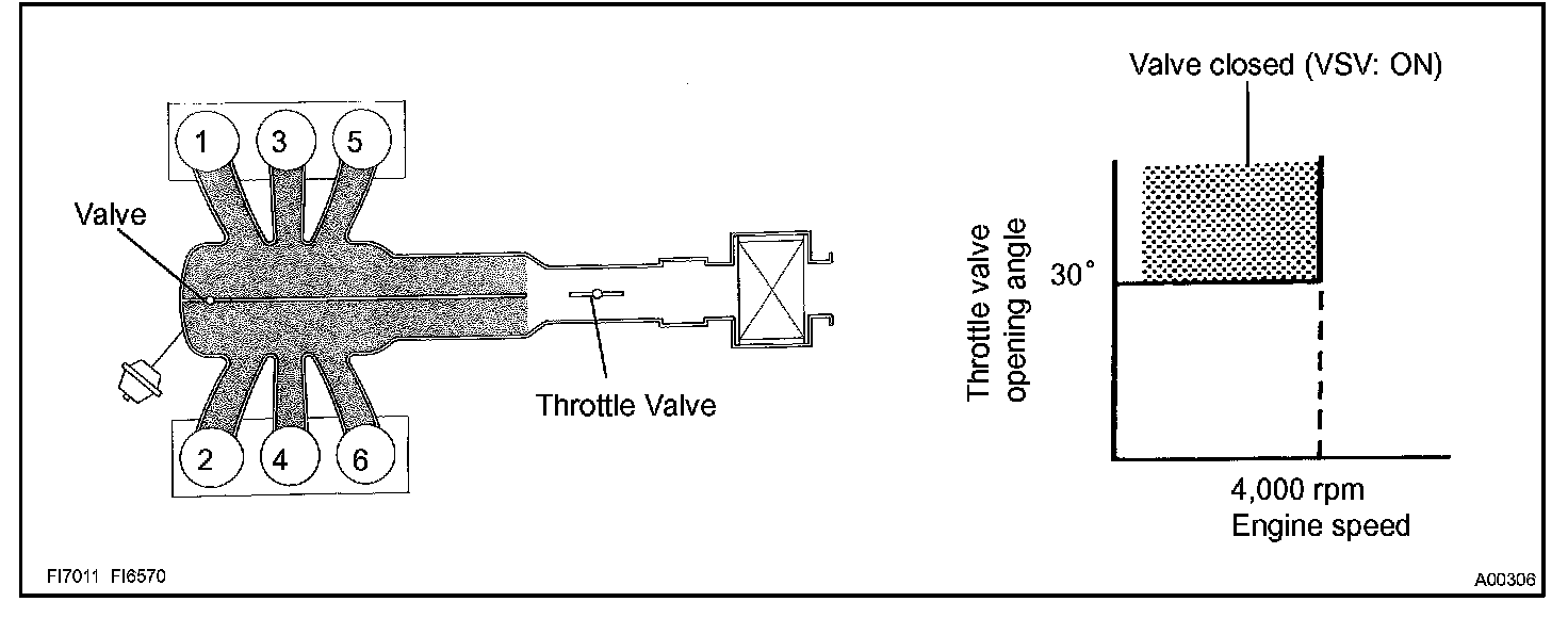 The ECM opens and closes the Intake Air Control valve in response to engine speed (RPM/NE).This system improves intake manifold tuning for better efficiency at low and high engine rpm. When the engine speed is 4,000 rpm or less and the throttle valve opening angle is 30 ° or more, the ECM turns the VSV ON or OFF to operate the intake air control valve.