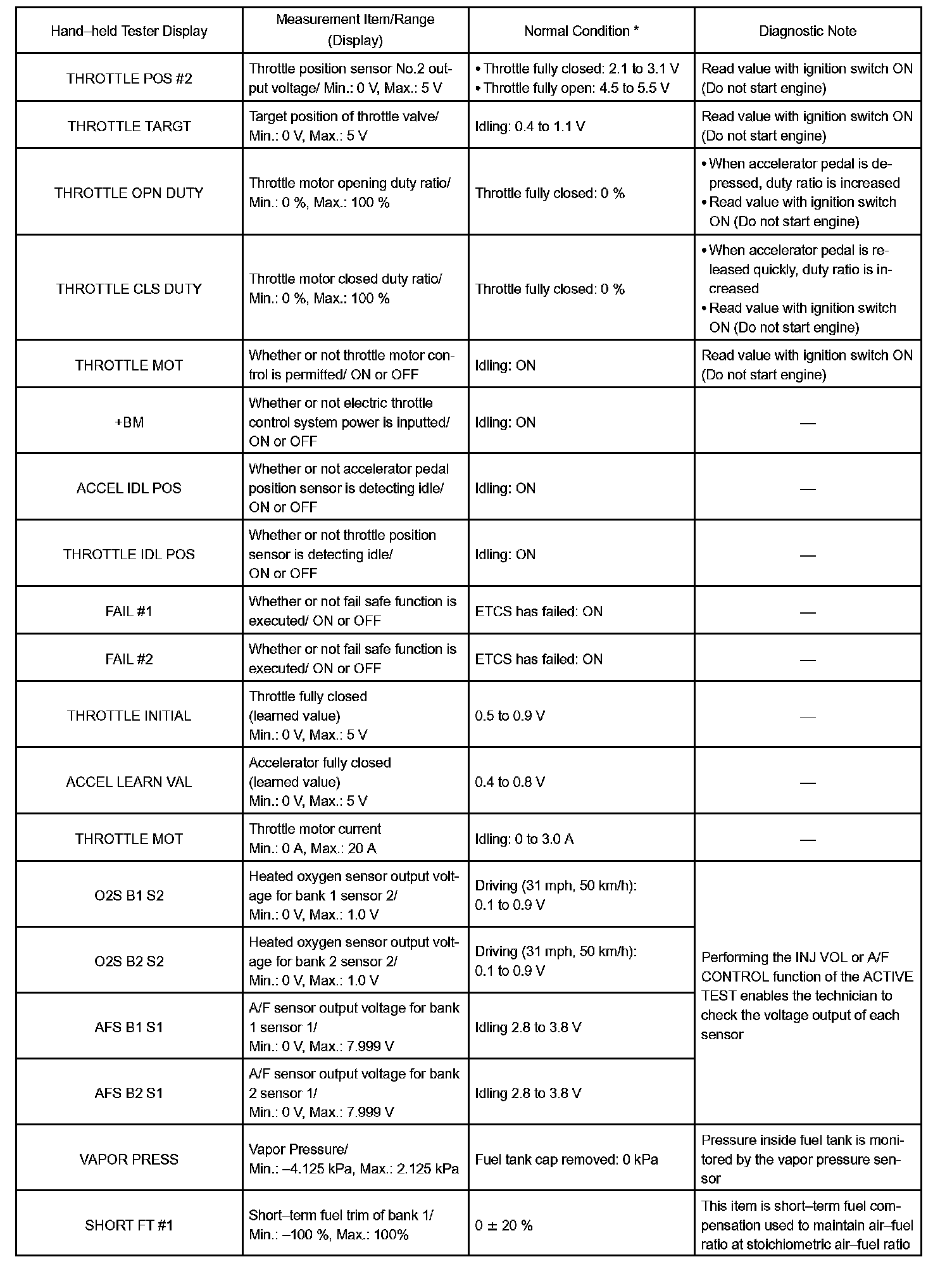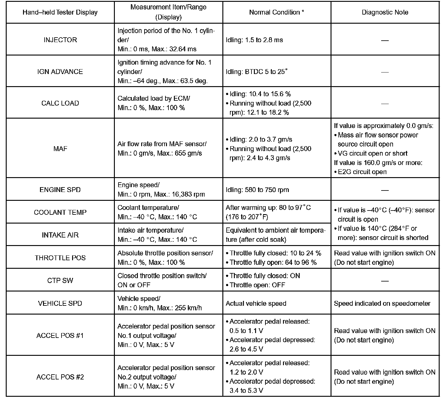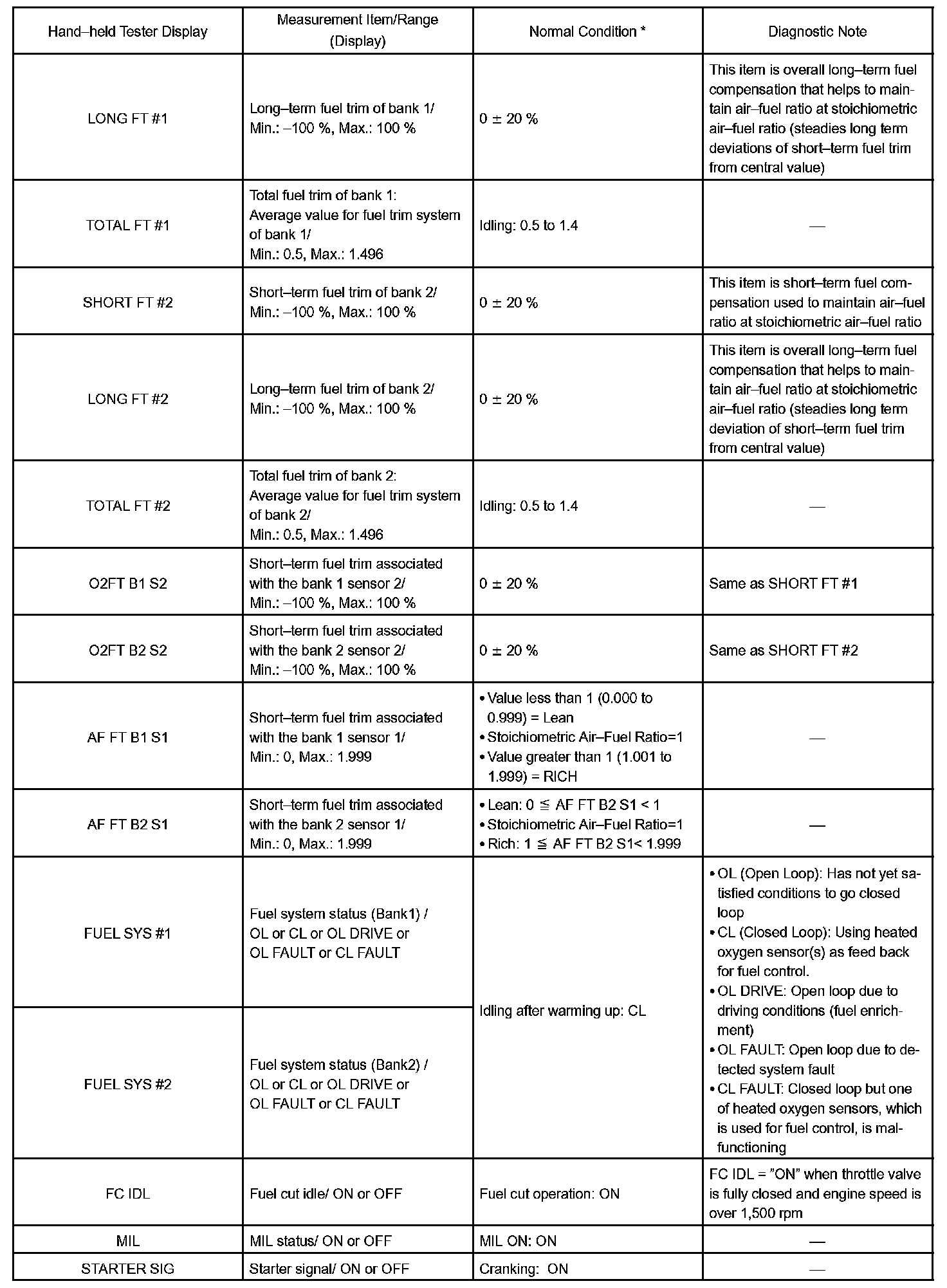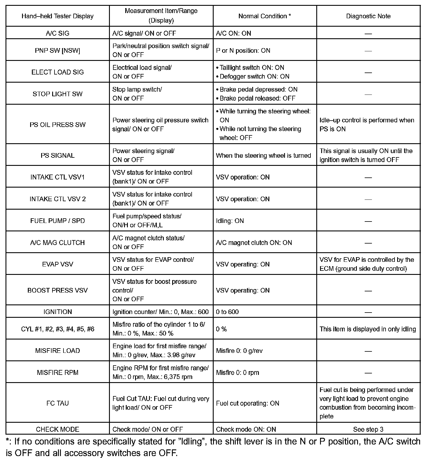 HINT: Using the hand-held tester DATA LIST allows switch, sensor, actuator and other item values to be read without removing any parts. Reading the DATA LIST early in troubleshooting is one way to shorten labor time.