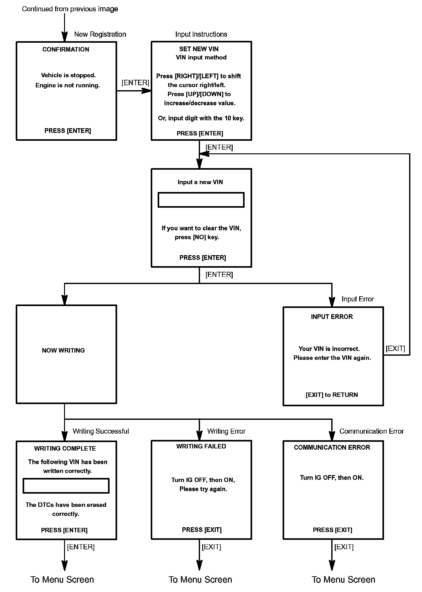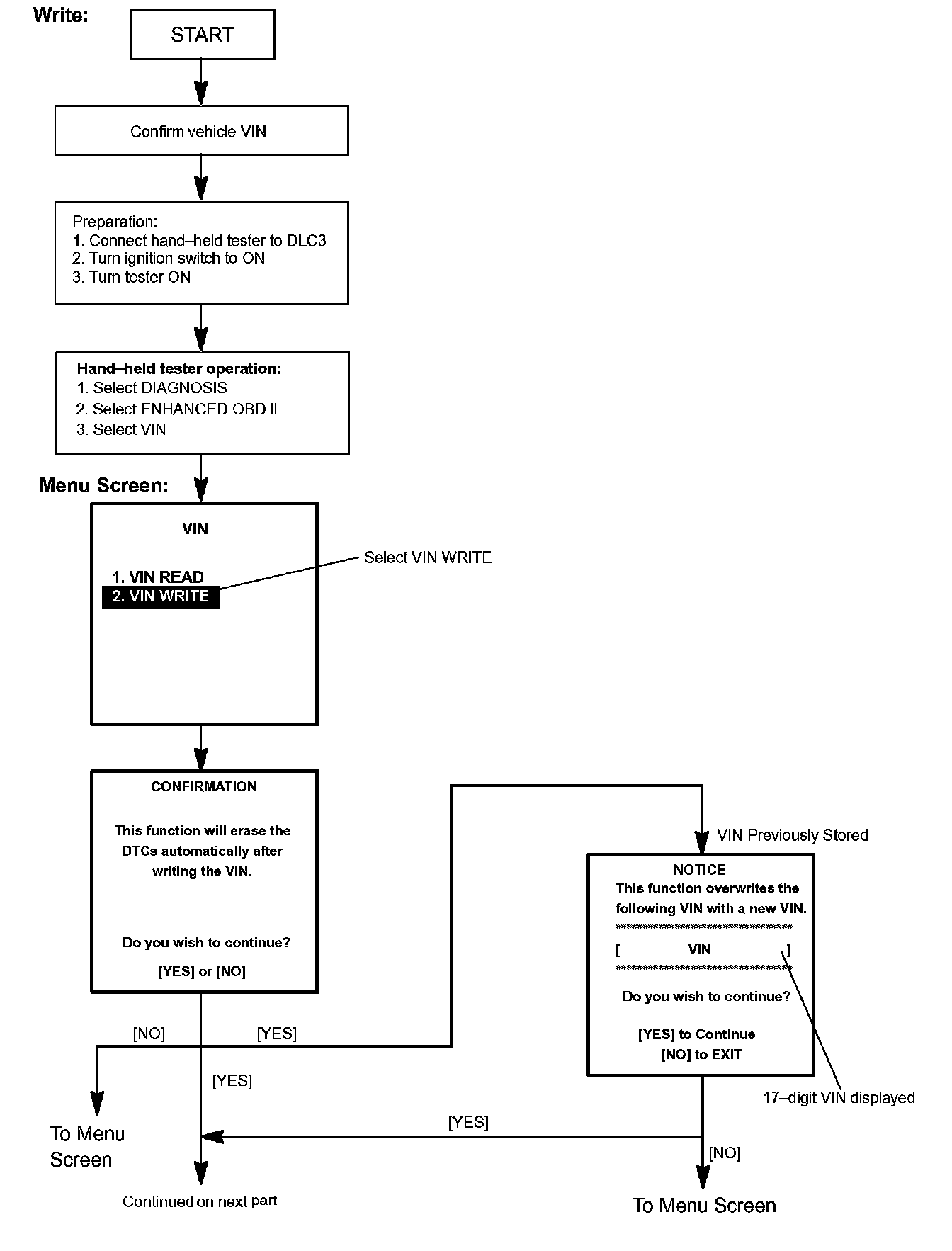 c. Write VIN: Explains the VIN writing process in a flowchart. This process allows the VIN to be input into the ECM. If the ECM is changed, or the VIN and VIN do not match, the VIN can be registered, or overwritten in the ECM by following this procedure.