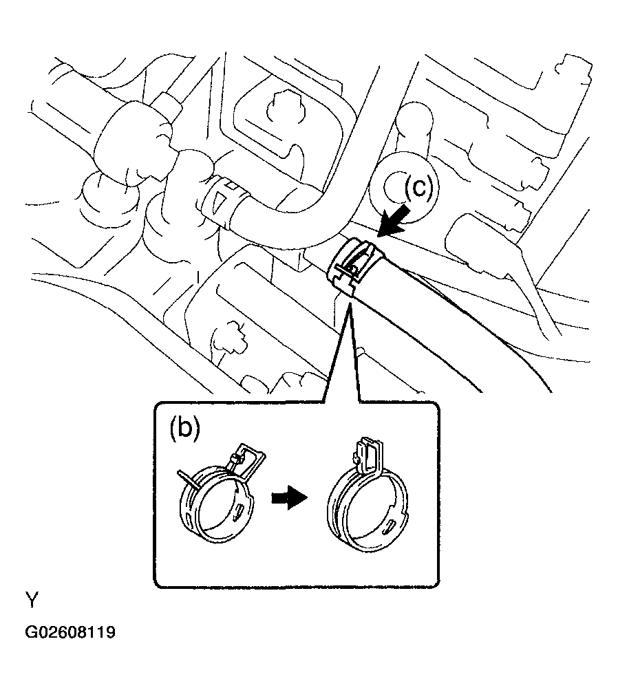 6. Lock the hose clamp as shown in Fig 7 and remove the water outlet together with the water by-pass hose No. 1.