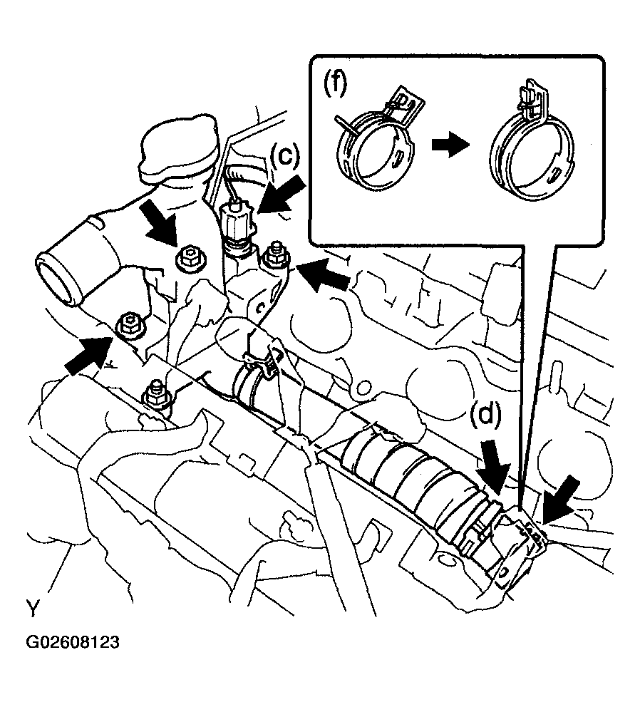 2. Install the water outlet together with the water by-pass hose No. 1 and unlock the hose clamp.