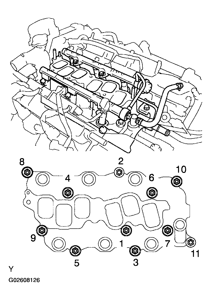6. In order to remove the intake manifold, using several steps, remove the 9 bolts and the 2 nuts in the sequence shown in Fig 5.