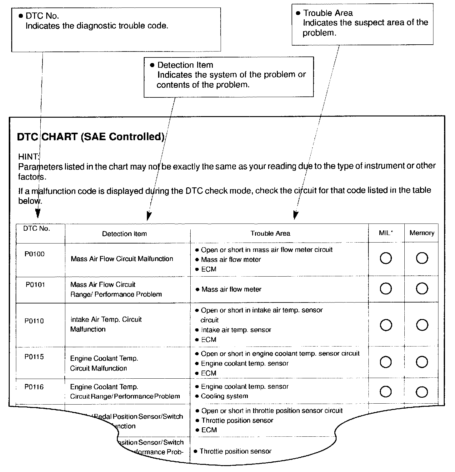 DIAGNOSTIC TROUBLE CODE CHARTThe inspection procedure is shown in the table. This table permits efficient and accurate troubleshooting using the diagnostic trouble codes displayed in the diagnostic trouble code check. Proceed with troubleshooting in accordance with the inspection procedure given in the diagnostic chart corresponding to the diagnostic trouble codes displayed. The engine diagnostic trouble code chart is shown as an example.