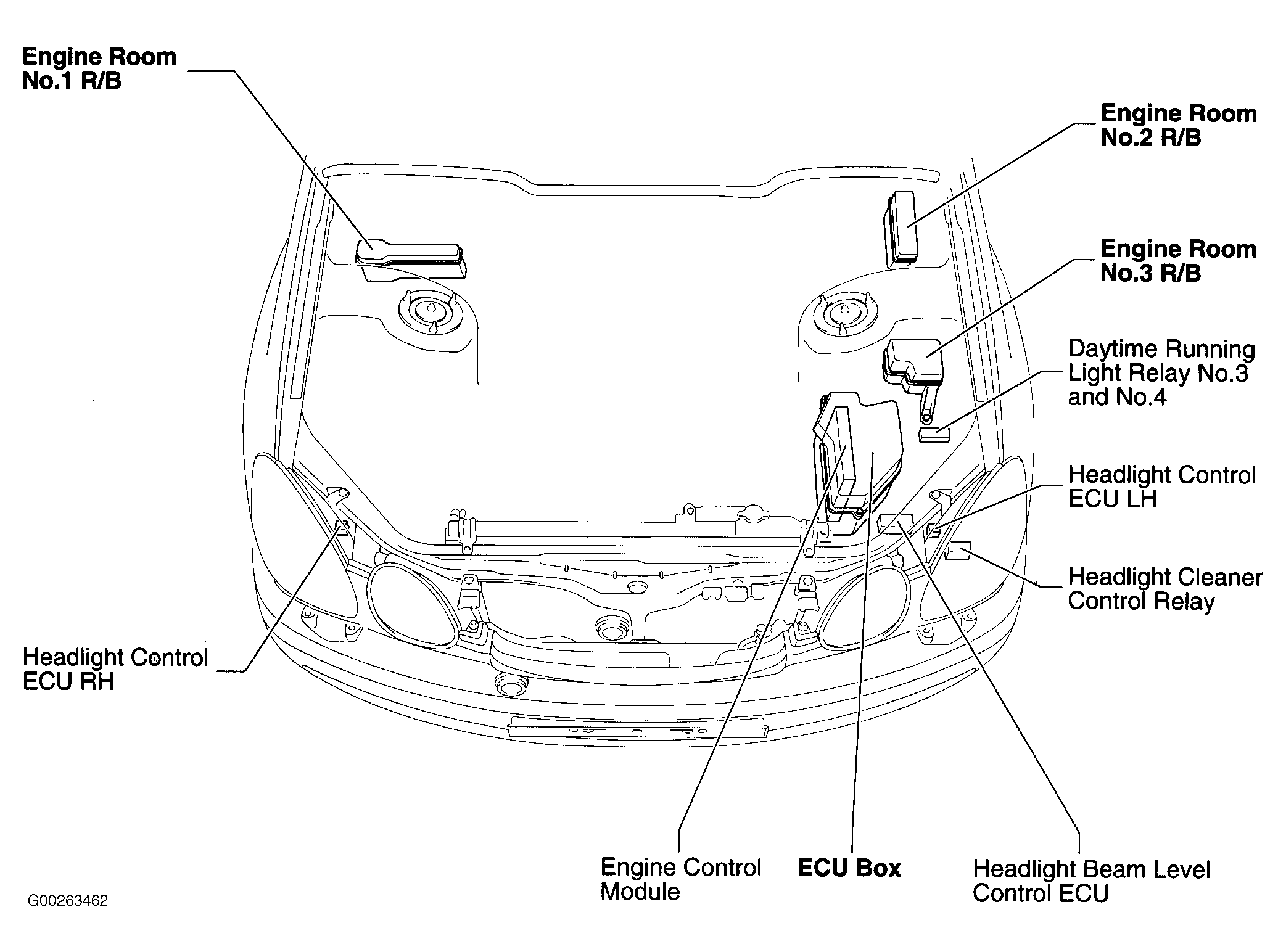 Headlight Beam Level Control ECU At left front corner of engine compartment. See Figure.