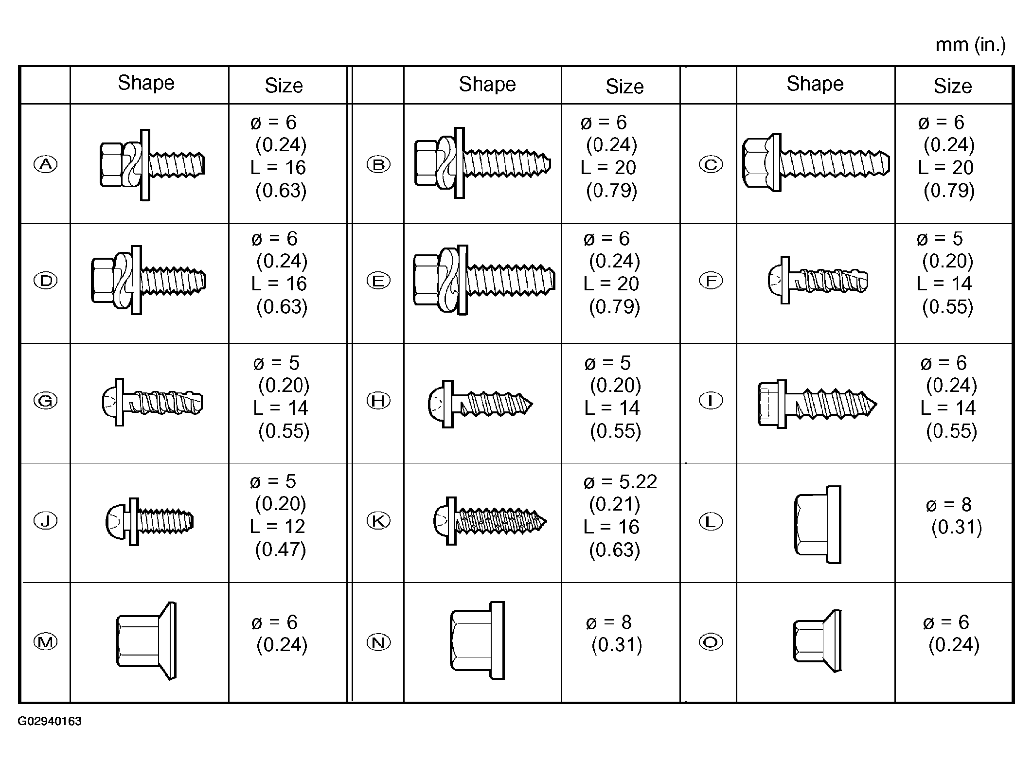 Screw shapes and size are indicated in Fig 3. The codes ("A"-"O") correspond to those indicated on Fig 1 and Fig 2.