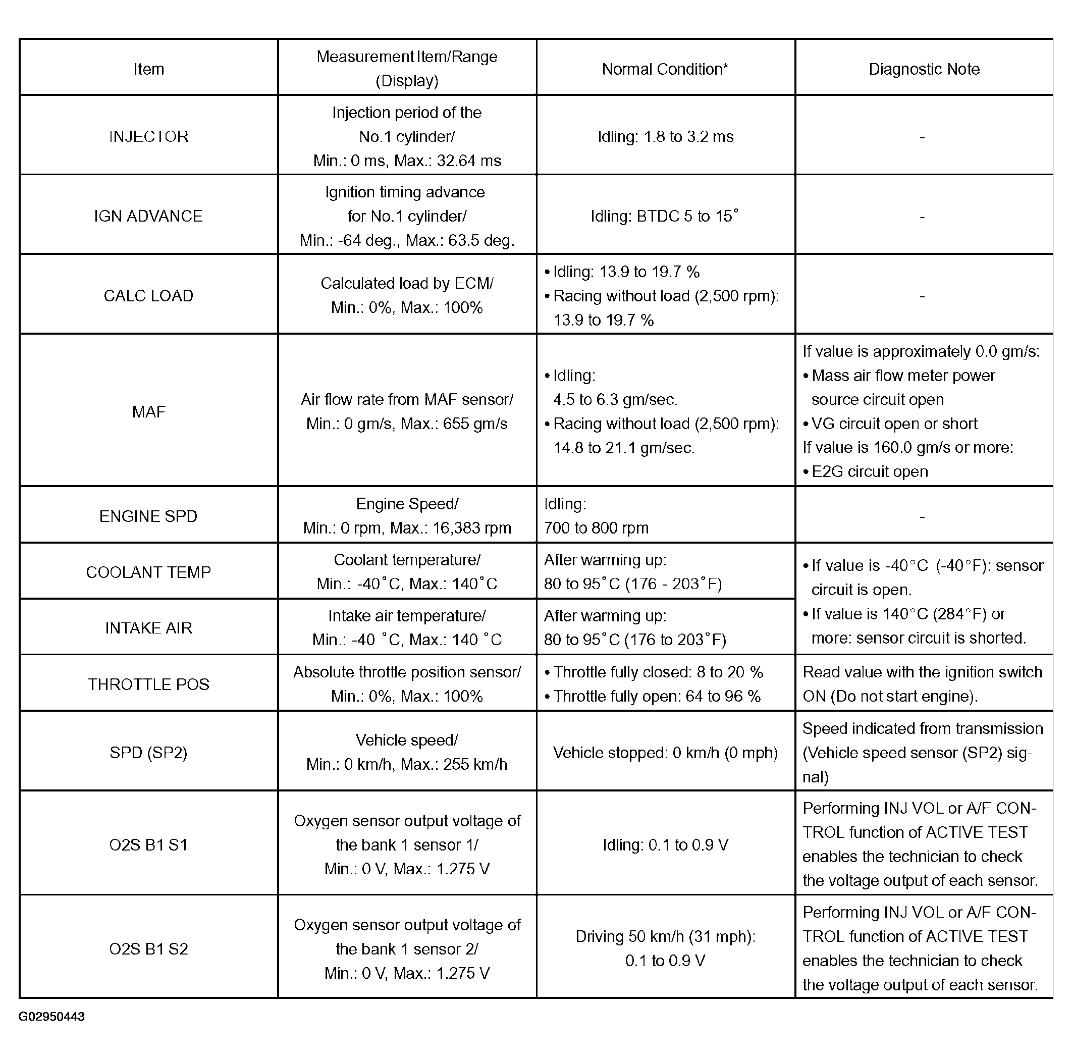 NOTE: In the Fig 8 below, the values listed under "Normal Condition" are reference values. Do not depend solely on these reference values when deciding whether a part is faulty or not.- Warm up the engine.
