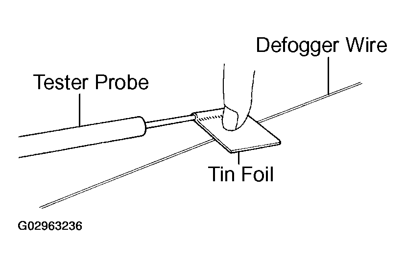 - Place the voltmeter positive (+) lead against the defogger wire on the battery side.