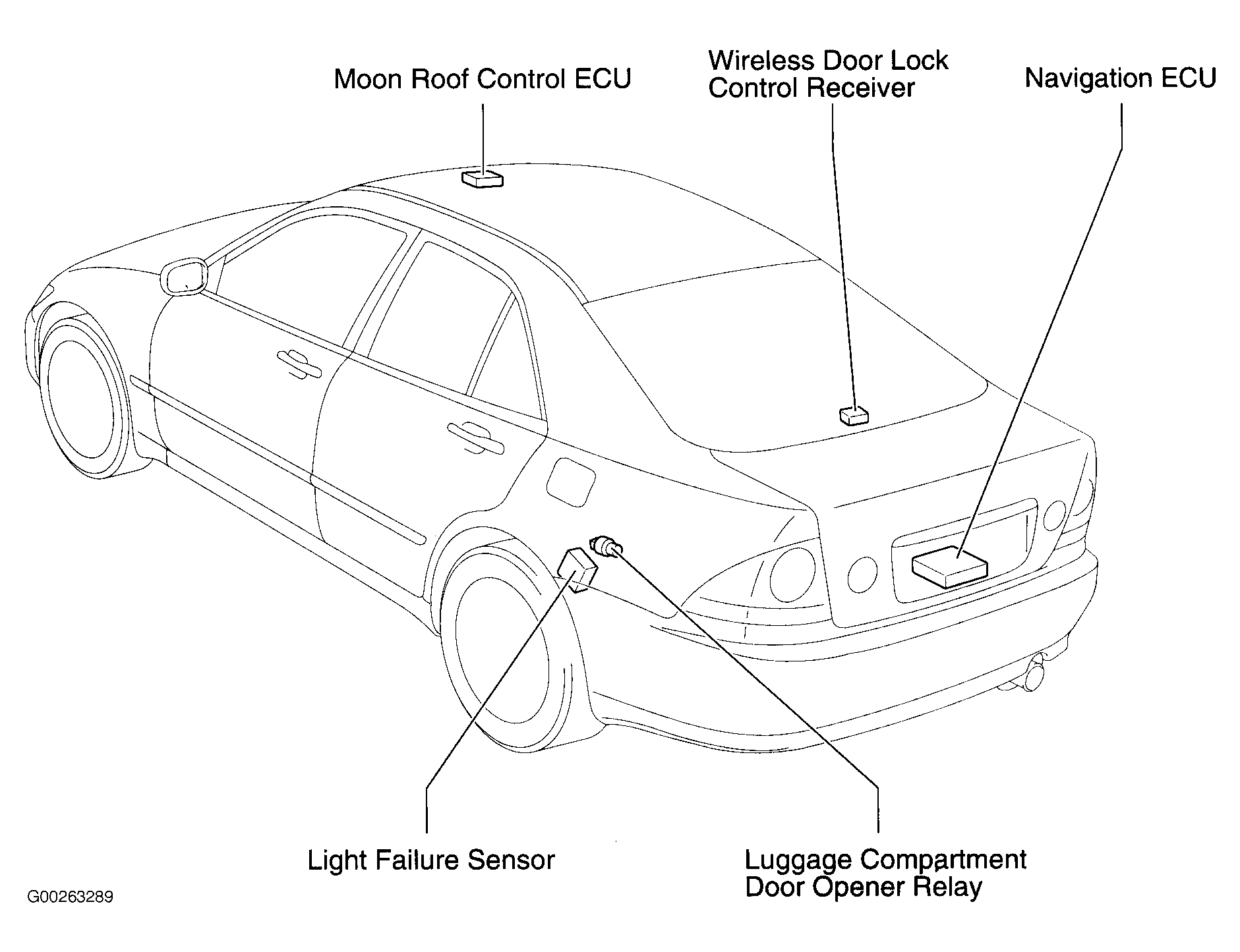 | Moon Roof Control ECU (Sedan) | On front center of roof. See Figure. |