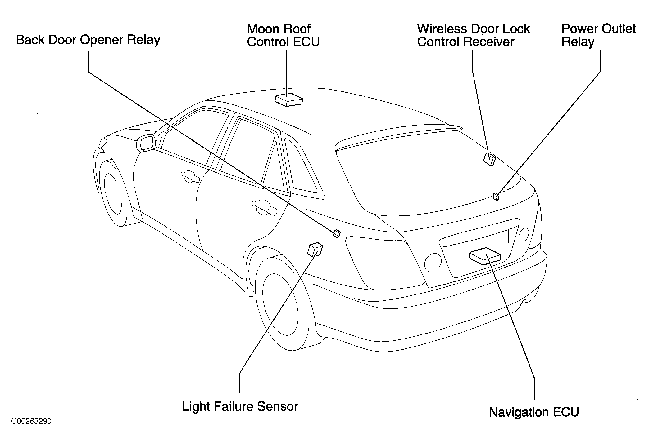 | Navigation ECU (Wagon) | Rear center of luggage compartment. See Figure. |