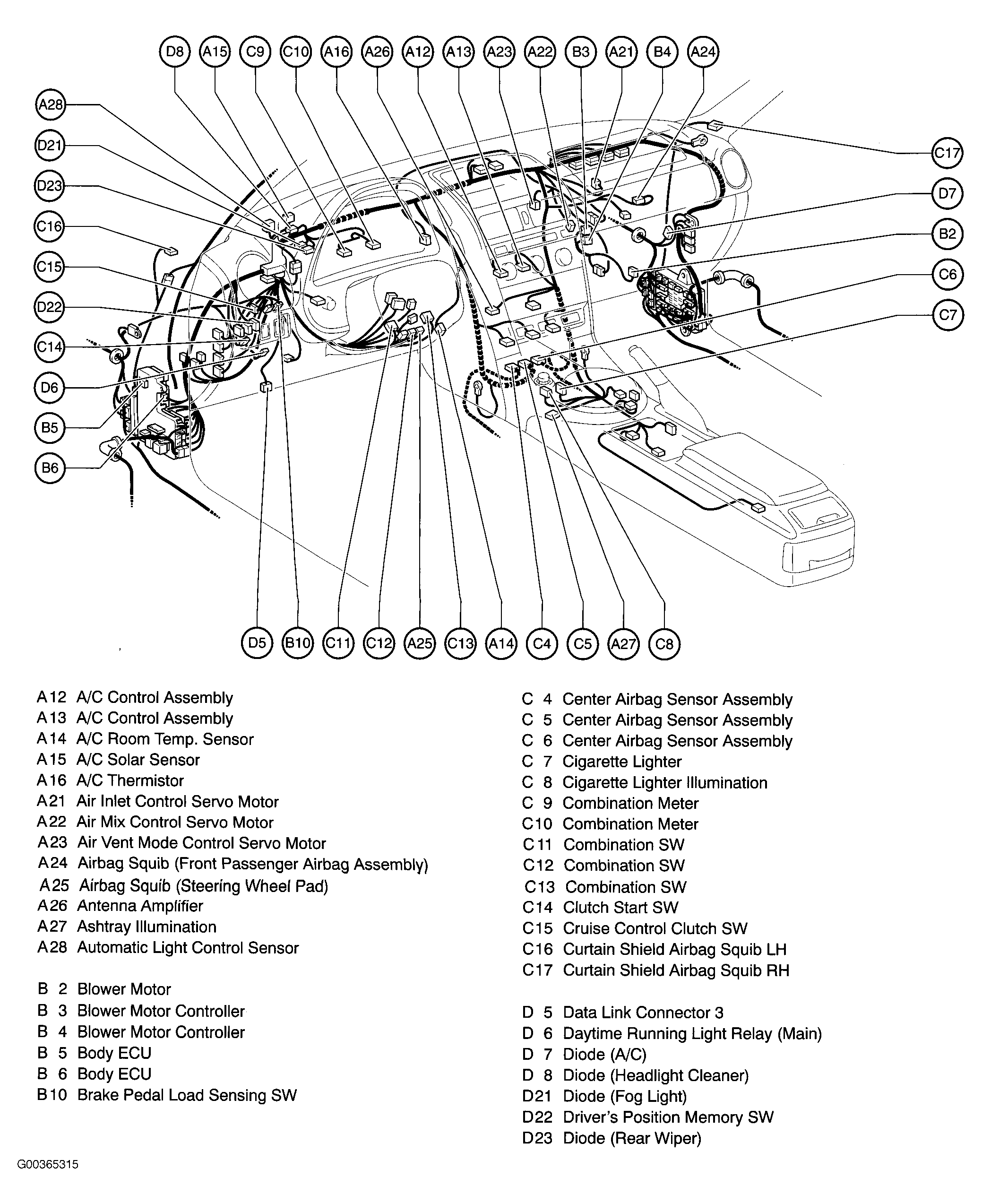 | Headlight Beam Level Control ECU | Behind left end of dash. See Figure. |
