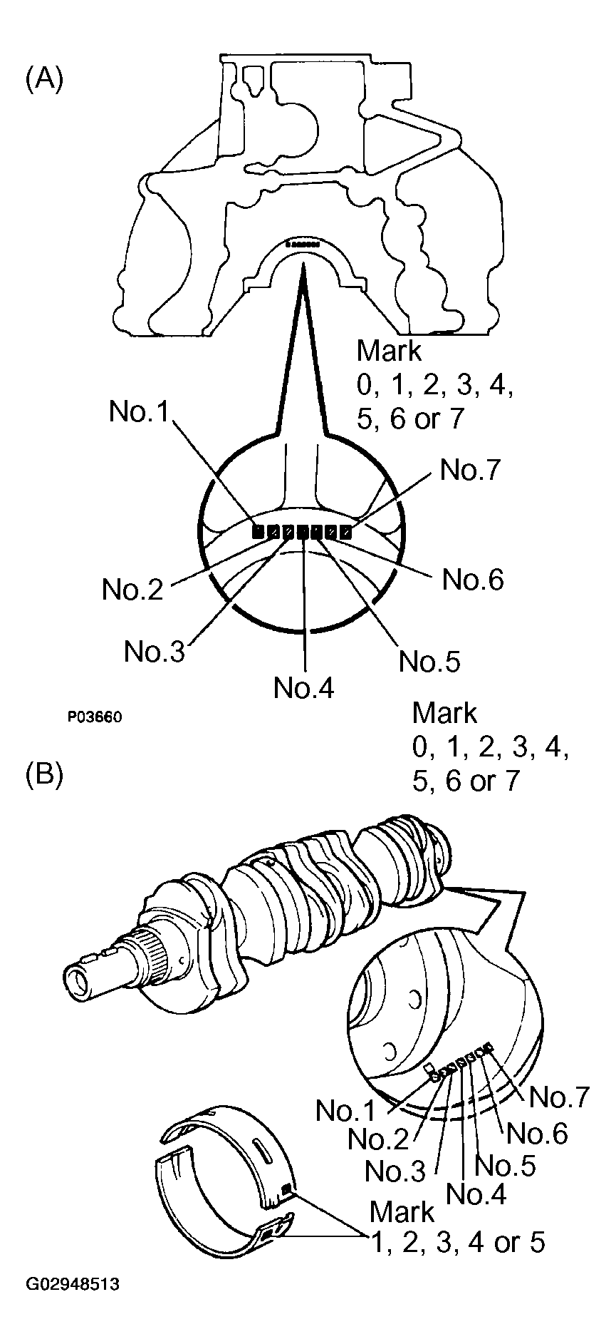 CYLINDER BLOCK MAIN JOURNAL BORE DIAMETER SPECIFICATIONMark "0" 66.020-66.022 mm (2.59922-2.59929 in.) Mark "1" 66.022-66.024 mm (2.59929-2.59936 in.) Mark "2" 66.024-66.026 mm (2.59936-2.59944 in.) Mark "3" 66.026-66.028 mm (2.59944-2.59952 in.) Mark "4" 66.028-66.030 mm (2.59952-2.59960 in.) Mark "5" 66.030-66.032 mm (2.59960-2.59968 in.) Mark "6" 66.032-66.034 mm (2.59968-2.59976 in.) Mark "7" 66.034-66.036 mm (2.59976-2.59984 in.) Crankshaft main journal diameter (B):