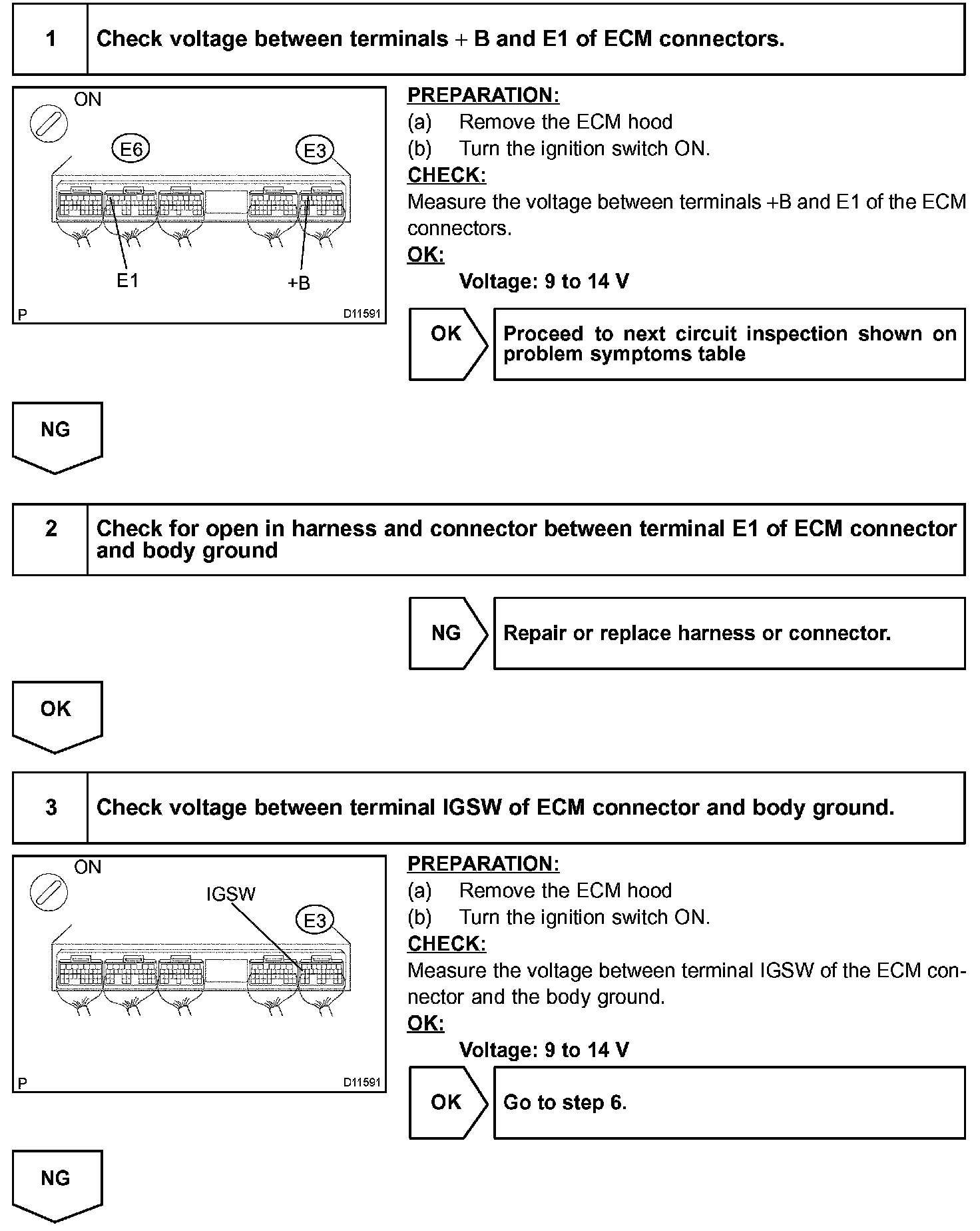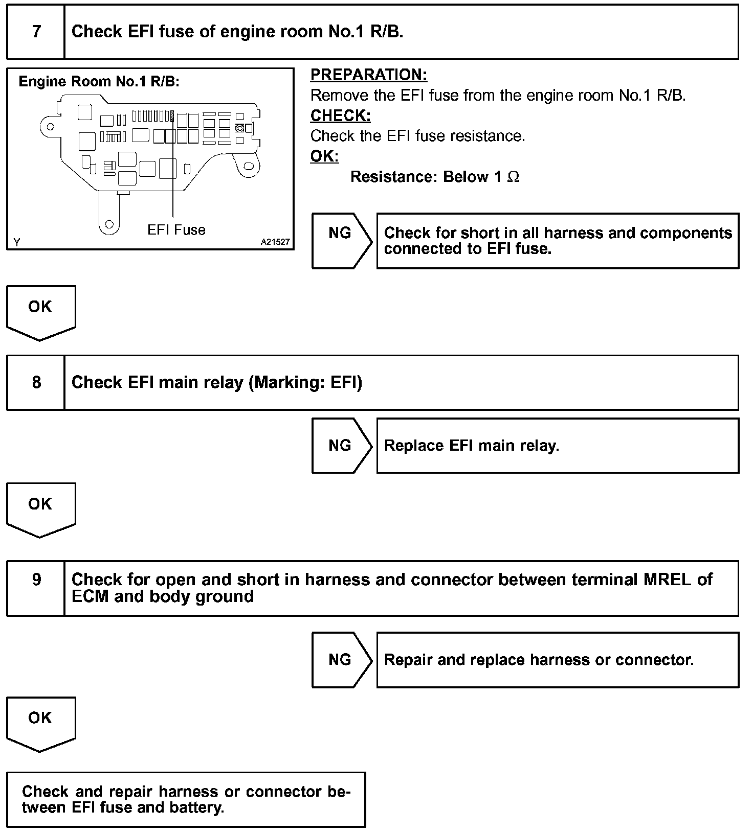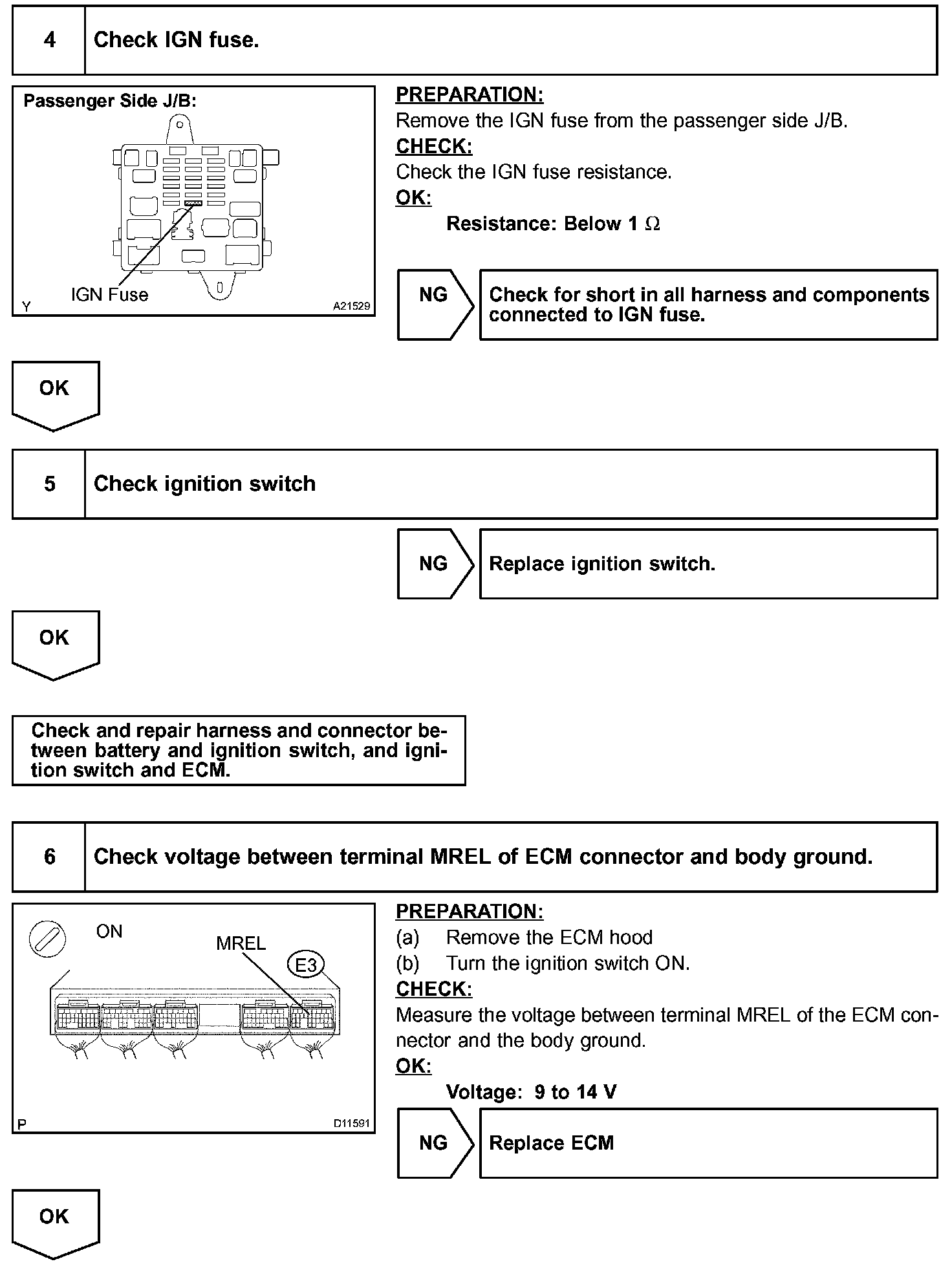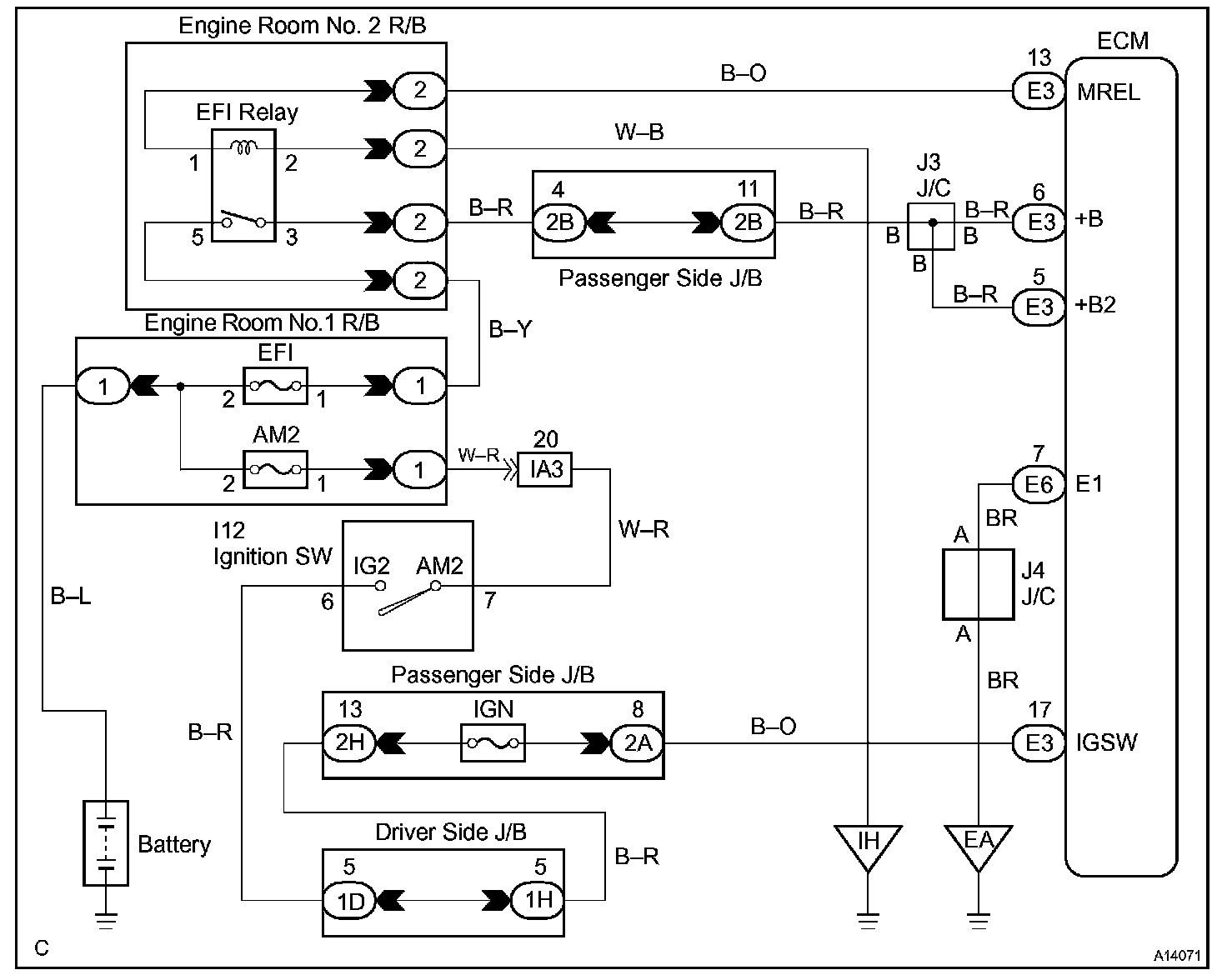 This signal causes current to flow to the coil, closing the contacts of the EFI main relay and supplying power to terminals +B and B2 of the ECM.