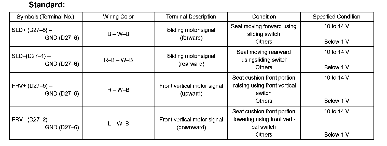 If the result is not as specified, replace the power seat or the ECU may have a malfunction.