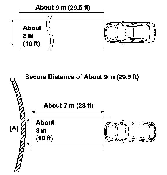 - Perform measurement indoors on level ground and in front of a blank wall. Park the vehicle at least 9 m (29.5 ft) from the wall. When performing adjustment outdoors, make sure that it is NOT raining or snowing.