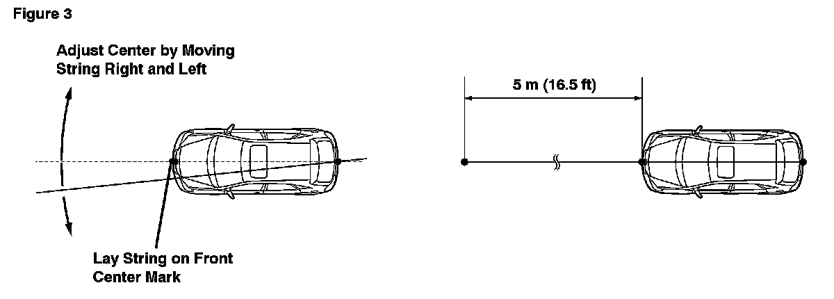 D. Fix one end of the string to the rear center mark and adjust the other end so that the string will line up with the front center mark of the vehicle. Make a mark 5 m (16.5 ft) from the front of the vehicle where the string and the front vehicle center mark intersect.