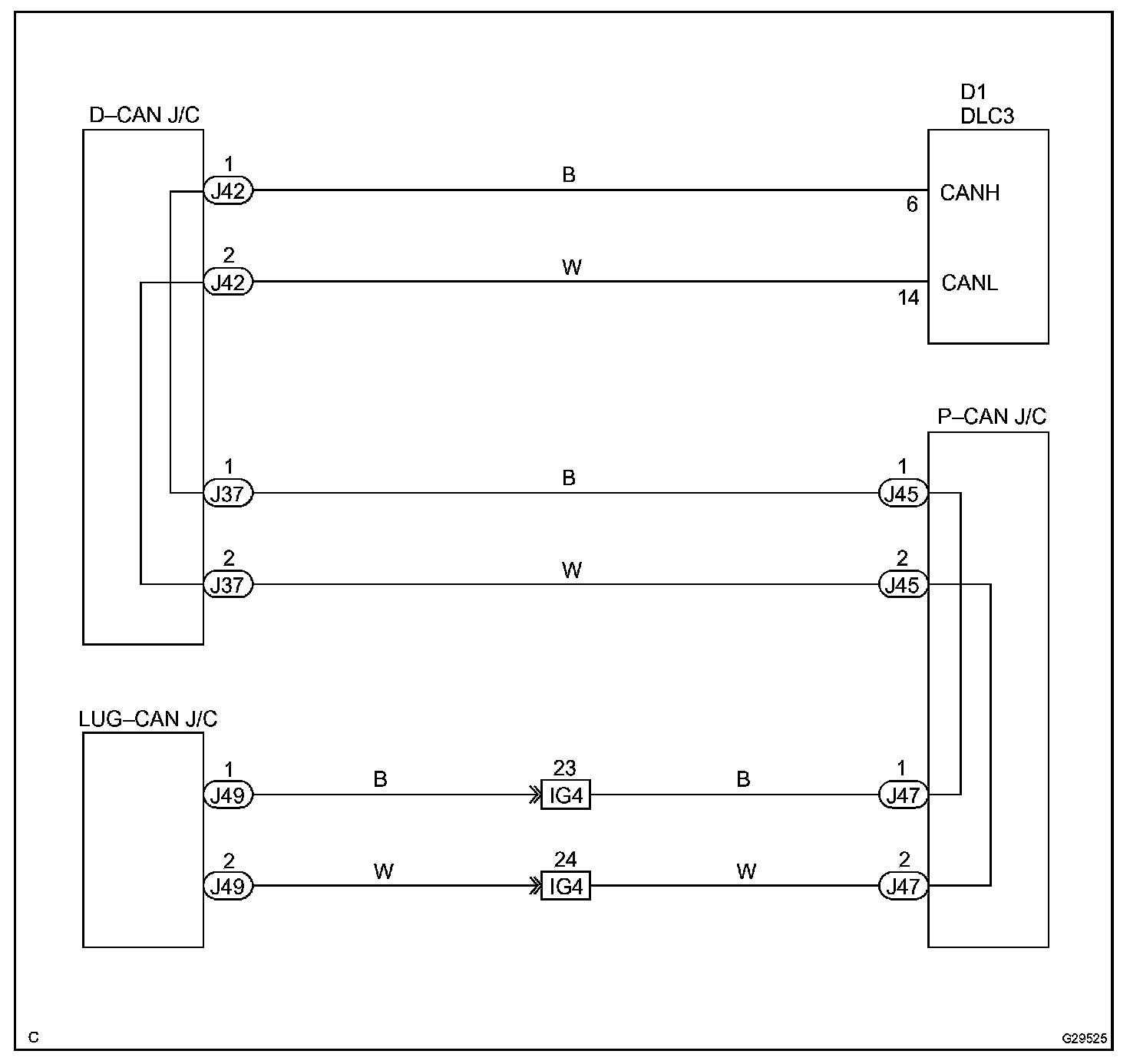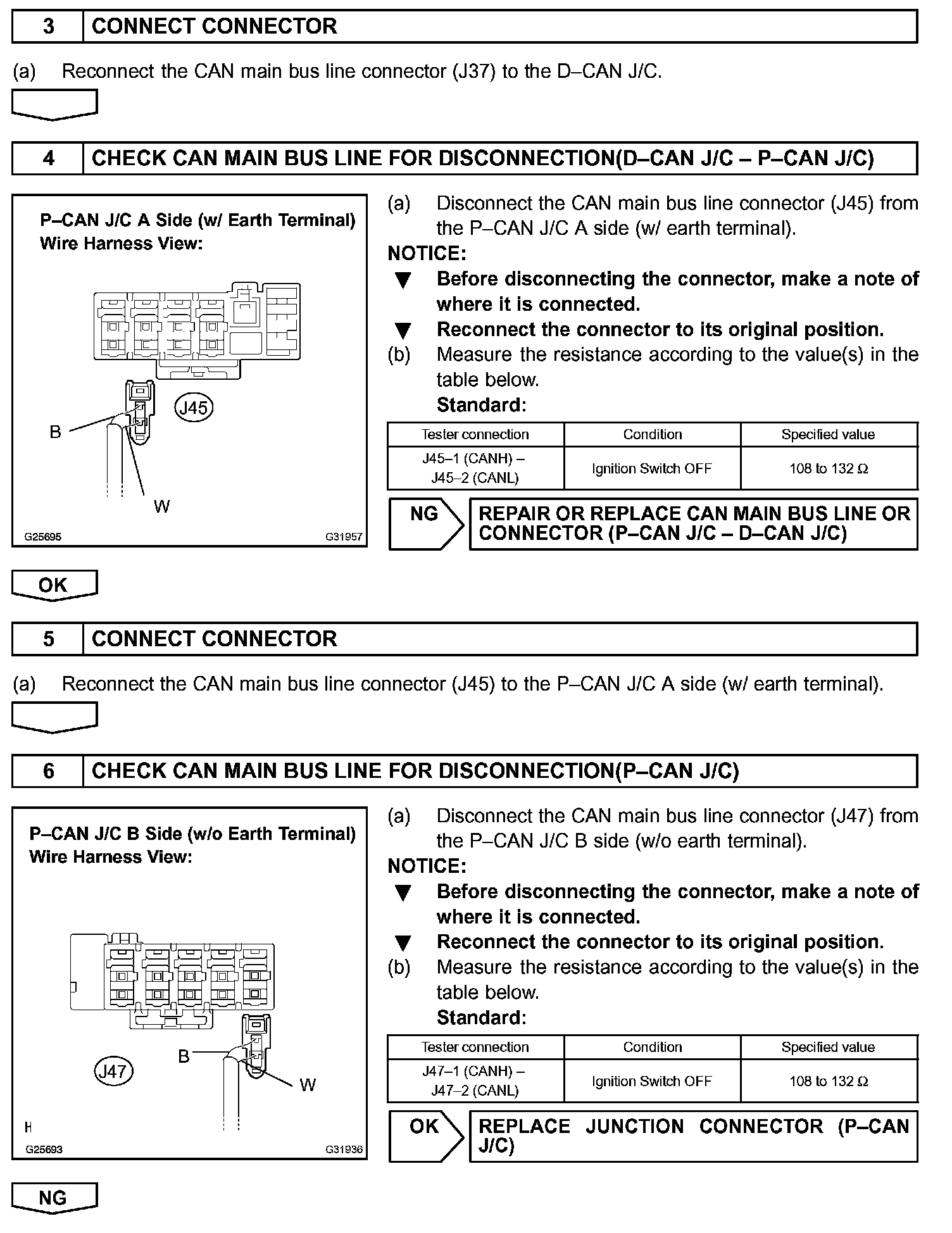 There may be an open circuit in the CAN main bus line and/or the DLC3 sub bus line when the resistance between terminals 6 (CANH) and 14 (CANL) of the DLC3 is 69 Ohm or more.