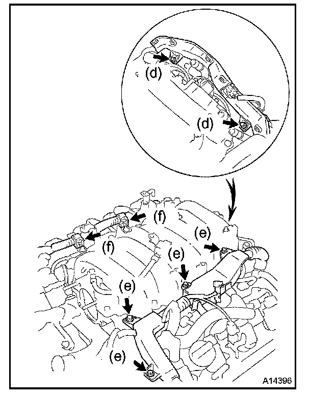 b. Install the upper and lower intake manifolds assembly with the 6 bolts and 4 nuts.