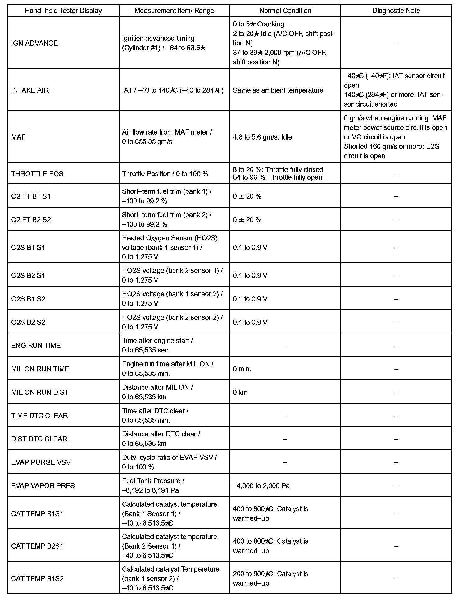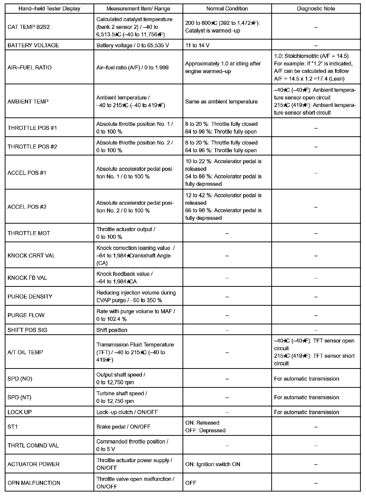 READ DATA LISTHINT: Using the hand-held tester's DATA LIST allows switch, sensor, actuator and other item values to be read without removing any parts. Reading the DATA LIST early in troubleshooting is one way to save time.