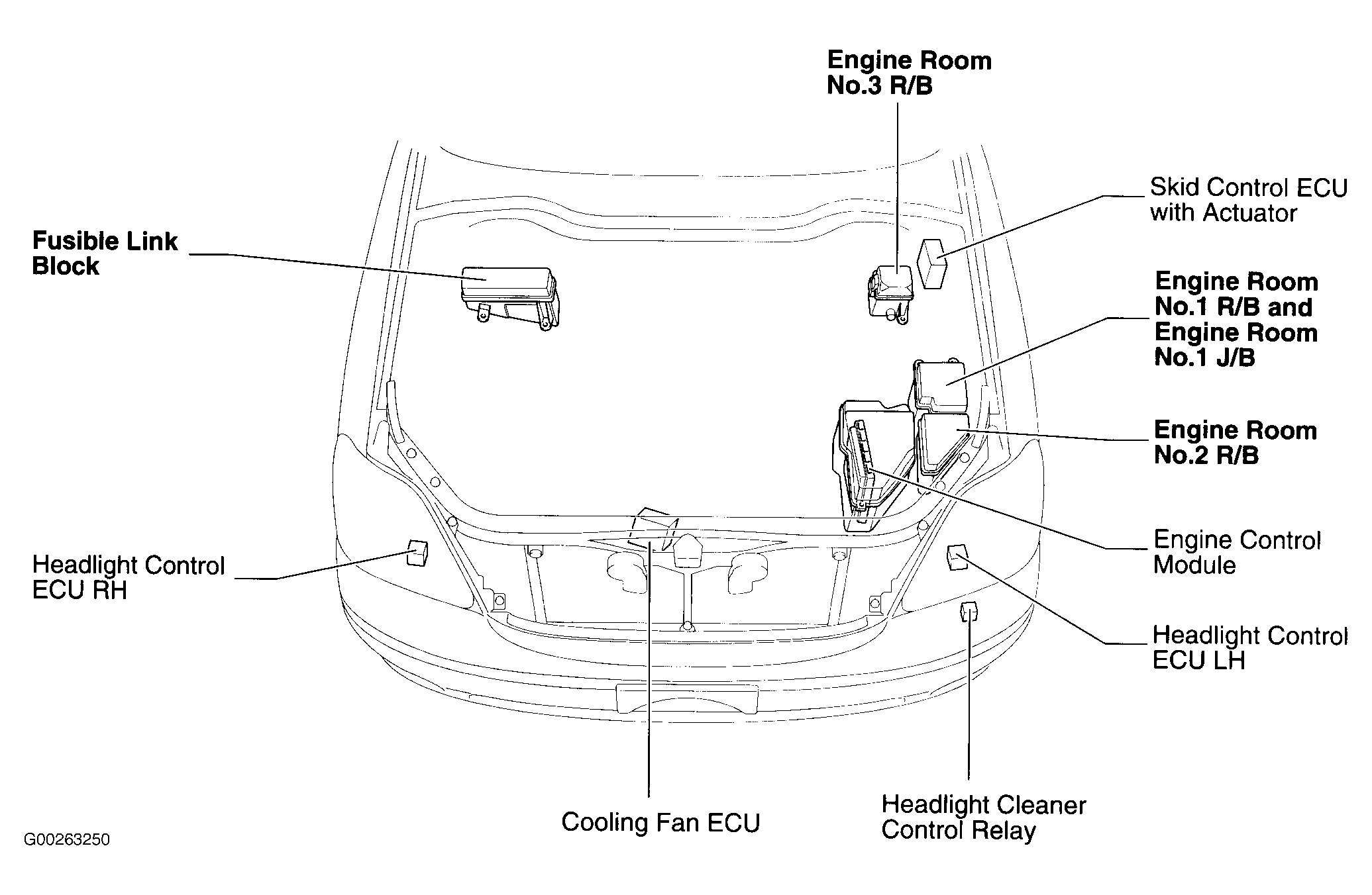 | Engine Room No. 2 R/B | On left front of engine compartment, behind headlight. See Figure. |