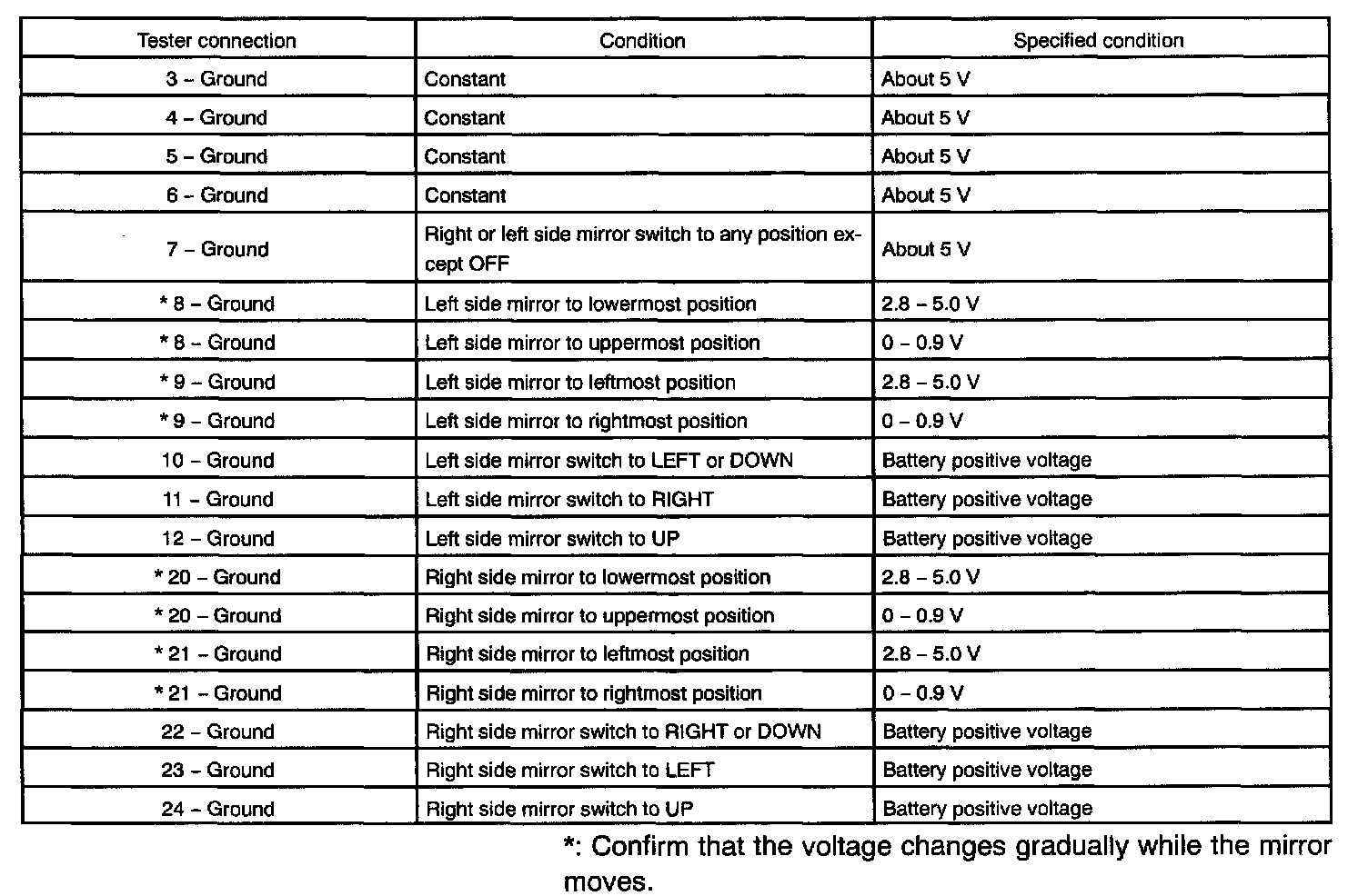 If the operation is not as specified, inspect the wire harness and mirror switch or motor assembly. Then if these are correct, replace the ECU.