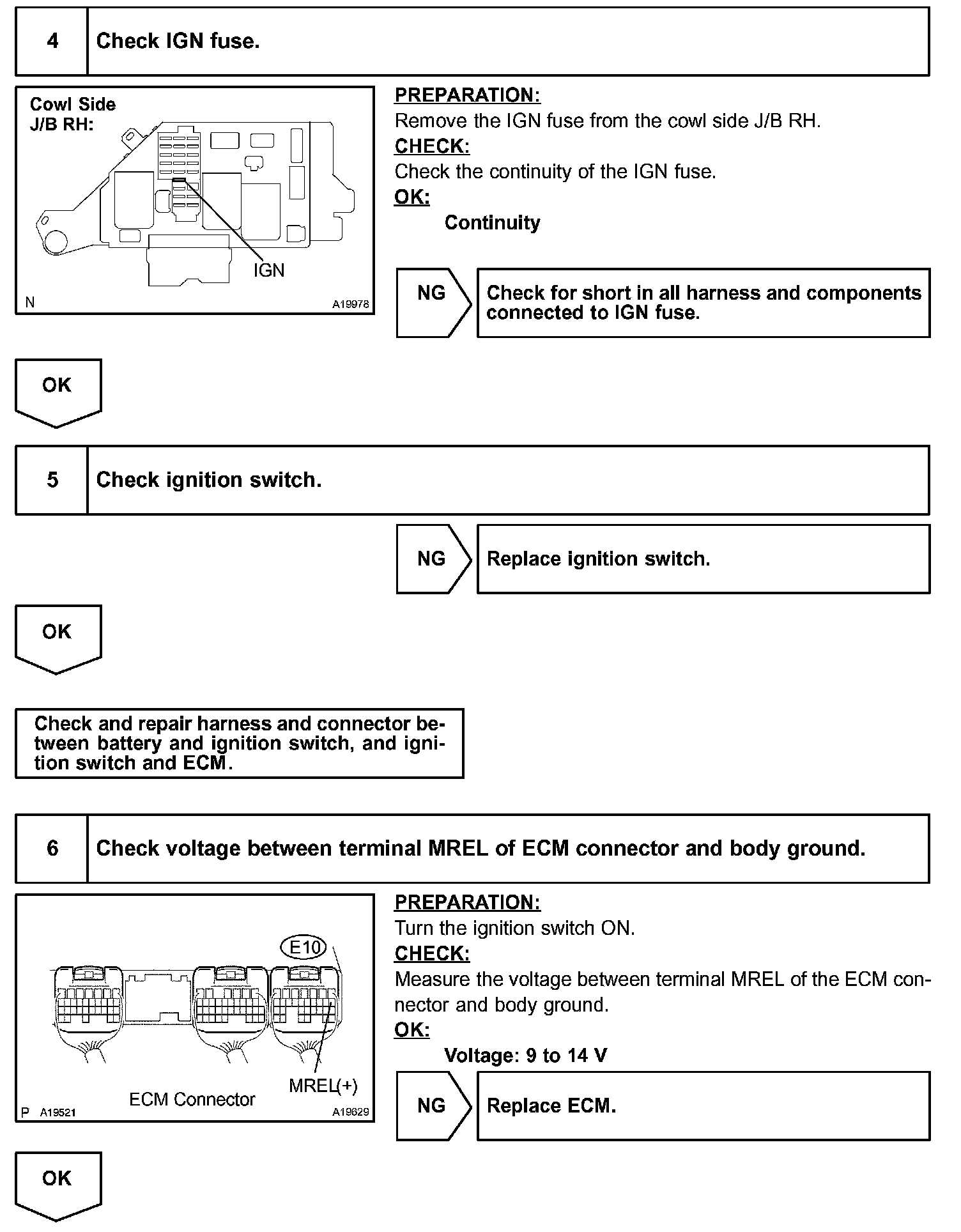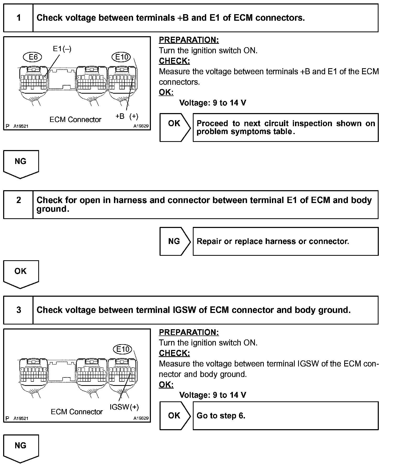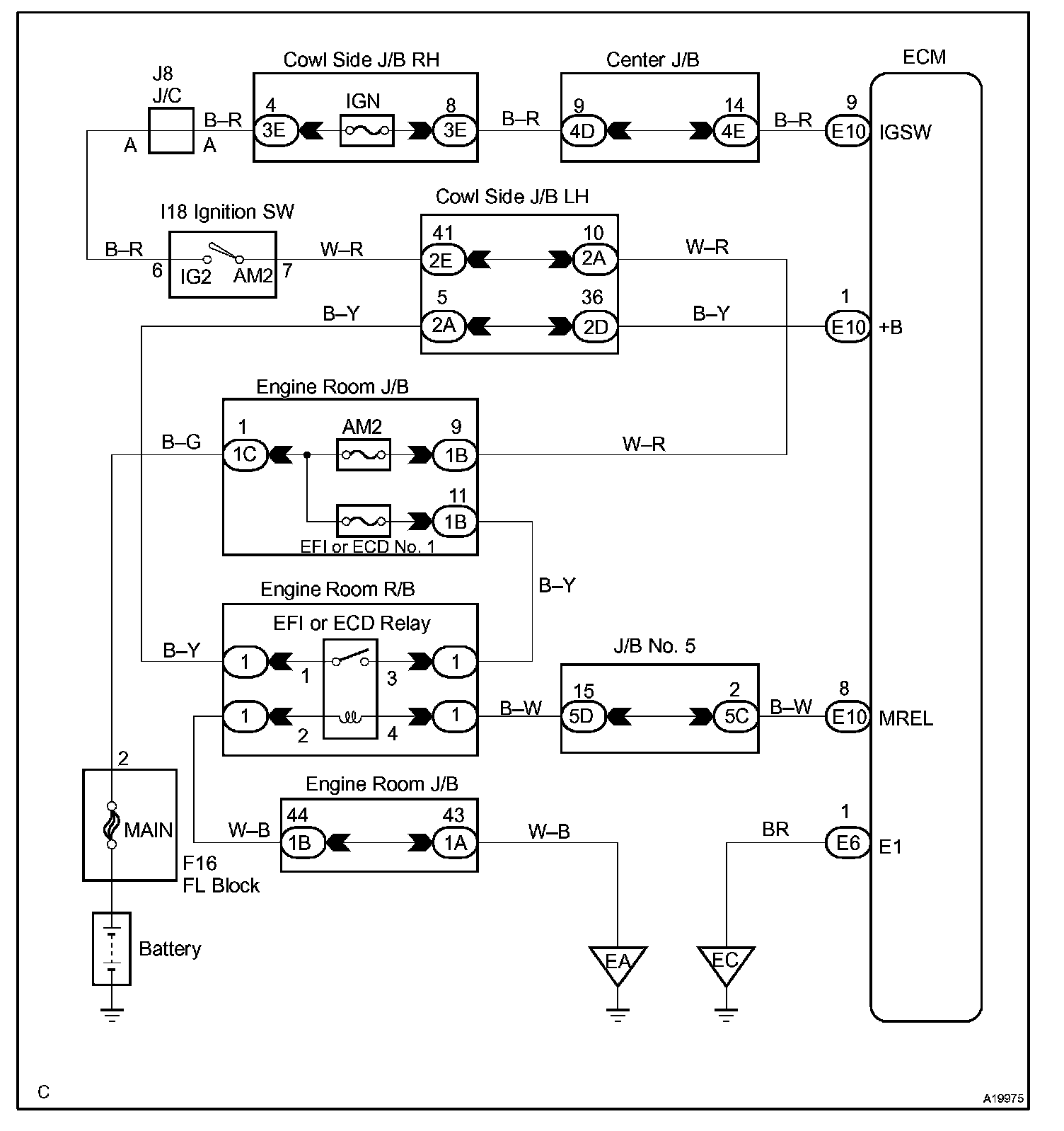 This signal causes current to flow to the coil, closing the contacts of the EFI or ECD relay and supplying power to terminal +B of the ECM.