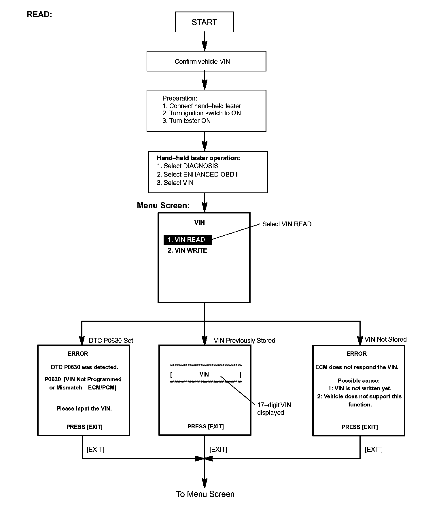 b. Read VIN: Explains the VIN reading process in a flowchart. This process allows the VIN stored in the ECM to be read, in order to confirm that the two VINs, provided with the vehicle and stored in the vehicle's ECM, are the same.